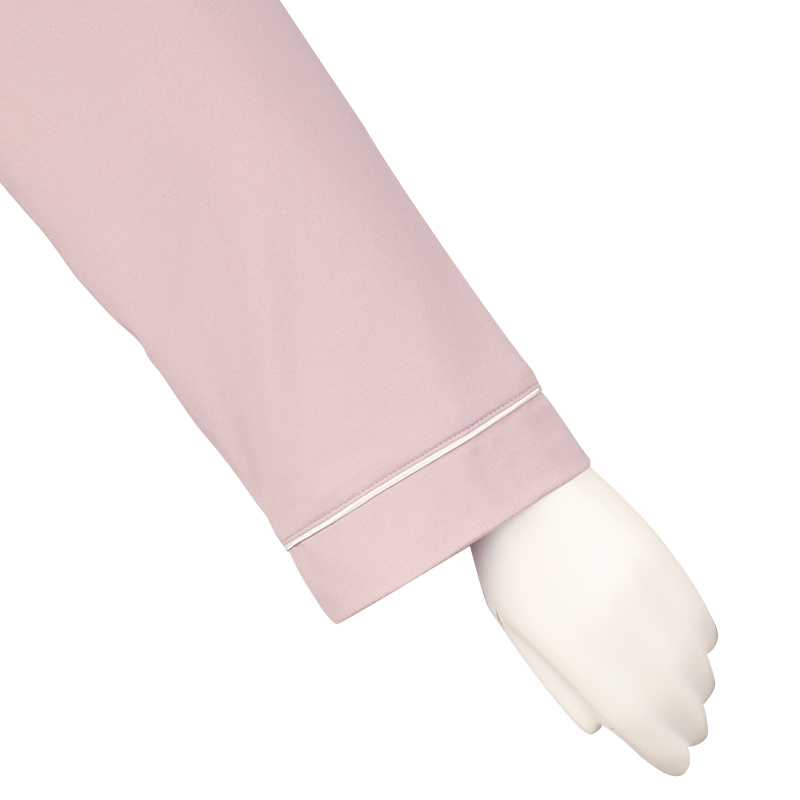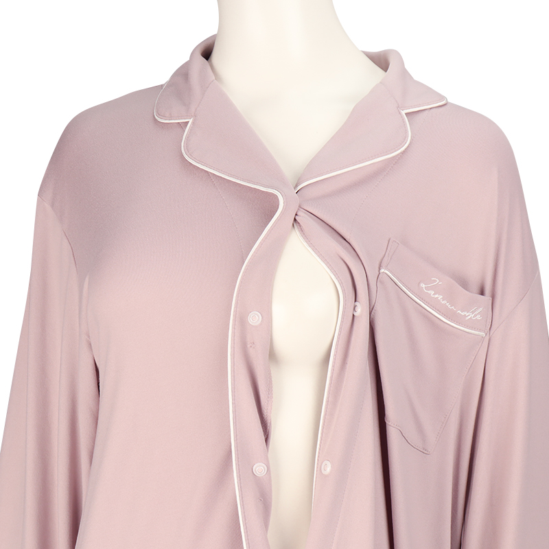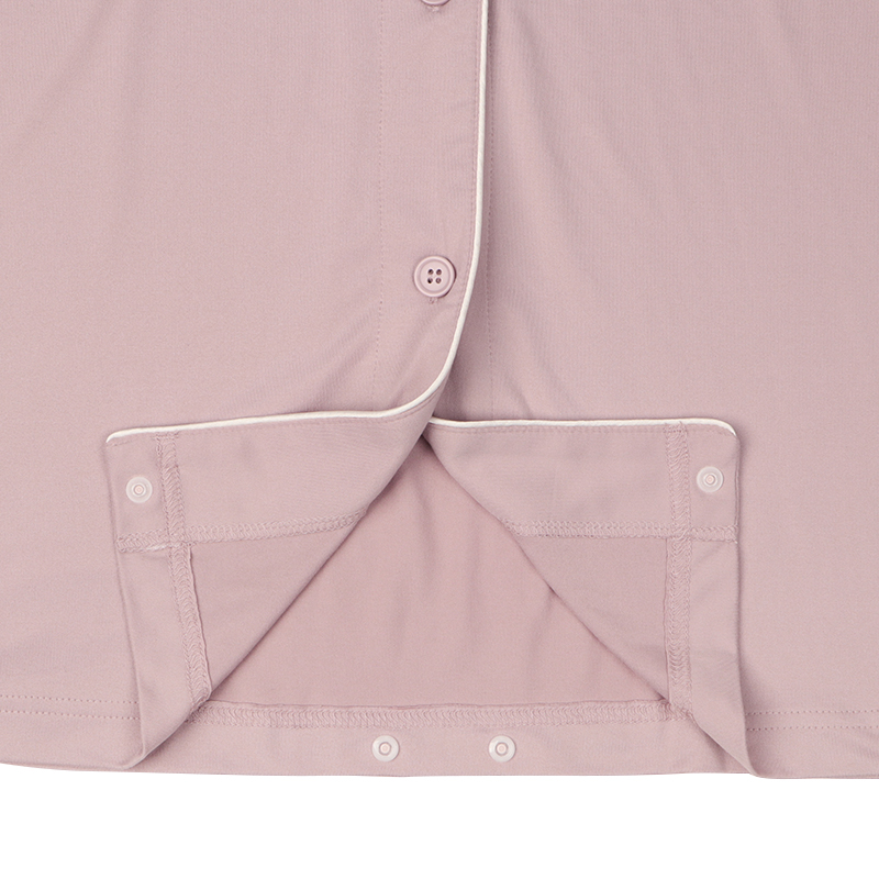 裾のスナップボタンを留めてロンパースとしても着られる、便利な2WAY仕様。寝ている時や回診時など、裾がまくり上がりません。