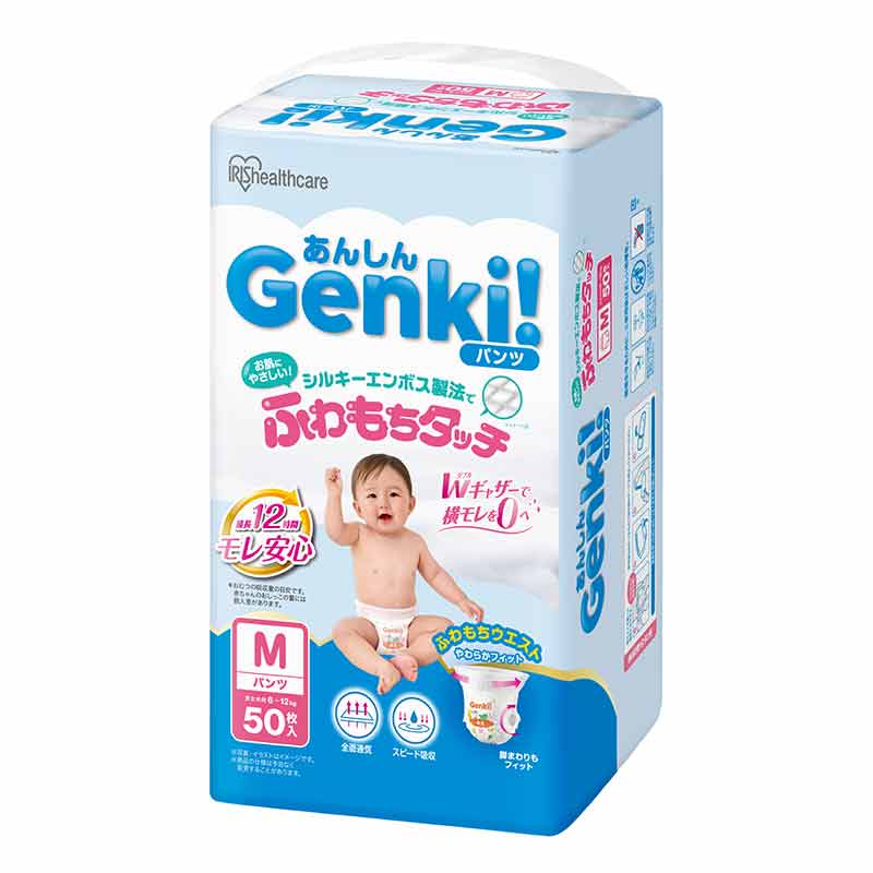 ●適用サイズ(適用体重/おなかまわり/脚まわり) Mサイズ:約6~12kg/約36~50cm/約19~30cm ●内容量:50枚 ●外装材:ポリエチレン ●素材 表面材:ポリオレフィン/ポリエステル不織布 吸水材:綿状パルプ、高分子吸水材、ポリオレフィン不織布 防水材:ポリオレフィンフィルム 止着材:ポリオレフィン 伸縮材:ポリウレタン 結合材:スチレン系エラストマー合成樹脂 ●使用上の注意 ・汚れた紙おむつは早くとりかえてください。 ・テープは直接お肌につけないでください。 ・誤って口に入れたり、のどにつまらせることのないよう保管場所に注意し、使用後はすぐに処理してください。 ●保管上の注意 ・開封後は、ほこりや虫が入り込まないよう、衛生的に保管してください。 ●使用後の処理 ・紙おむつに付着した大便は、トイレに始末してください。 ・汚れた部分を内側にして丸めて、不衛生にならないよう処理してください。 ・トイレに紙おむつを流さないでください。 ・使用後の紙おむつの廃棄方法は、お住まいの地域のルールに従ってください。 ・外出時に使った紙おむつは持ち帰りましょう。 ※Genki は王子ホールディングス株式会社の商標及び登録商標です。
