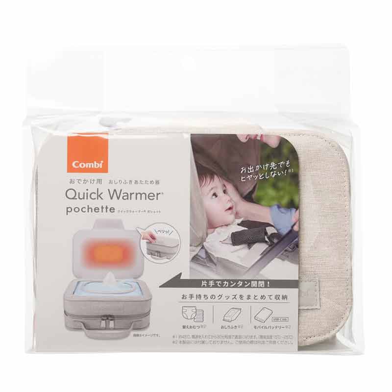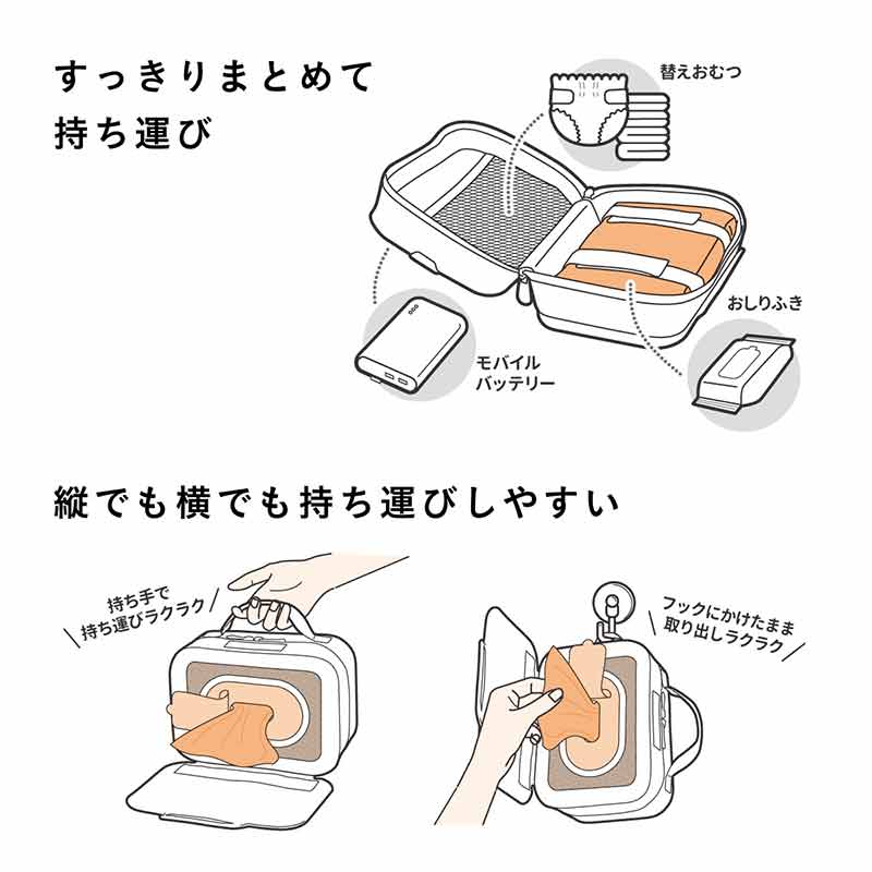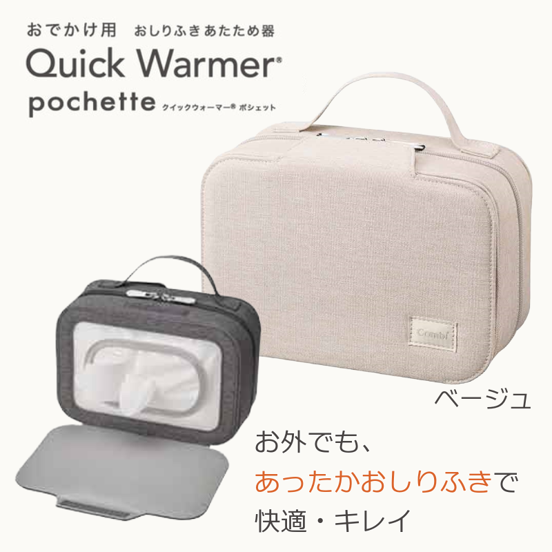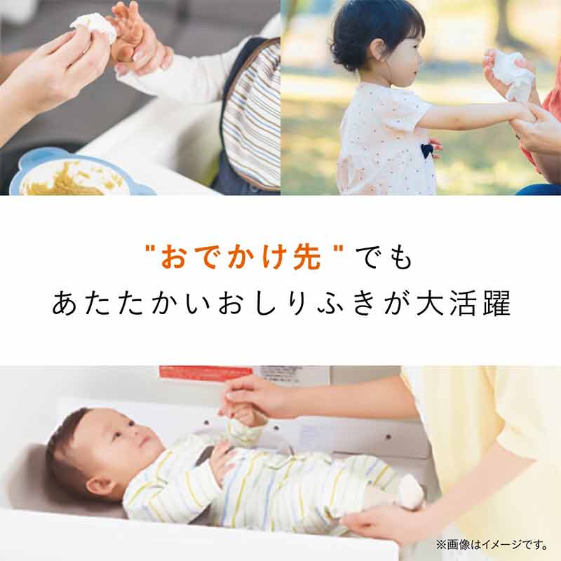 ・お外でも、あったかおしりふきで快適・キレイ おむつ替え、お食事のお手ふき、外遊びなど、お出かけ中は『ちょっとキレイにしたい』場面がたくさんあります。 そんな様々な場面で使えるポーチ型のクイックウォーマーが新登場。ヒヤっとしない心地よさを、お出かけ先でも。 ・モバイルバッテリーでどこでもあったか。 お手持ちのType-C対応モバイルバッテリーをつなげば、場所を選ばずおしりふきを温められます。 ※モバイルバッテリーは付属しておりません。 ・すっきりまとめて持ち運び ポーチの内側には替えのおむつやおしりふき、外側にはモバイルバッテリーがすっぽり収まるポケット付き。 ・ヒーターにピッタリ密着、ずっとあったか。 クイックウォーマーシリーズ共通の『トッ プウォーマーシステム』を採用。 ゴムバンド固定でおしりふきとヒーターがピタッと密着し、おしりふきをしっかりあたためます。 ・縦でも横でも持ち運びしやすい 持ち運びや吊り下げに便利な持ち手とループ付き。 ・おしりふきの取り出しカンタン おしりふきの取り出しは蓋をぺりっと開けるだけ。 吊り下げたままでもラクに取り出しできます。 ●使用方法 1.おしりふきをセットする おしりふきのフラップ(取り出し部のシール)が下側になるようにおしりふきを置く。 2.おしりふきを温める 外ポケット内部から出ているUSBコネクタに、モバイルバッテリーまたはACアダプタを接続する。 ※電源を入れてから30分程度で適温(約45℃)になります。(環境温度15℃~25℃) 3.おしりふきを取り出す おしりふき取り出し口からおしりふきのフラップを開け、おしりふきを取り出す。