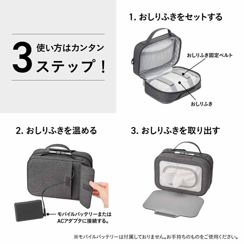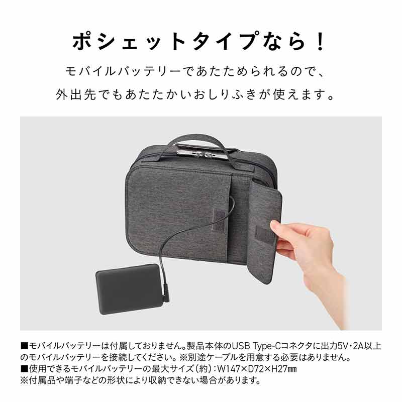 ●モバイルバッテリー別売り ※USB Type-Cのコネクタがついているため、別途ケーブルを用意する必要はありません。 ●使用できるモバイルバッテリーの最 大サイズ W147×D72×H27mm ※付属品や端子などの形状により、ポケットに収納できない場合があります。 ●使用できるモバイルバッテリー規格 ・使用する電源の定格出力:5V/2A以上 ・使用するモバイルバッテリー容量:5,000mAh以上 ・USBコネクタの形状:Type-C ●商品サイズ(mm):W225×D93×H155 ●重量293g ●使用できるおしりふきのパッケージサイズ(約):W170×D110×H65(mm)以下 ●使用できないおしりふきのタイプ ・上記記載の使用できるパッケージサイズ以上のおしりふき ・取り出し口がプラスチック製のタイプ(ヒーターが密着せず、おしりふきが温まりません。) ・トイレに流せるタイプ(本製品で仕様すると、取り出す際におしりふきがやぶれやすくなります。) ・結露が著しく生じるタイプ ・乾きが著しいタイプ ※使用した際に乾燥が著しいタイプは、次回より別のおしりふきをお試し下さい。 ・おしりふきとして市販されているシート以外の除菌シートやウェットティッシュなど。 ●収納アイテム目安 ・本体内部:替えおむつSサイズ約3枚+新品のおしりふき1パック ・外ポケット:モバイルバッテリー1台 ●主要素材 ・ポーチ生地:ポリエステル、アルミ蒸着シート ・ファスナー:ナイロン、スチール