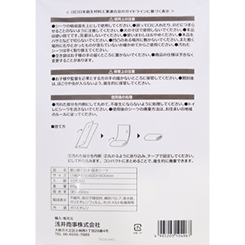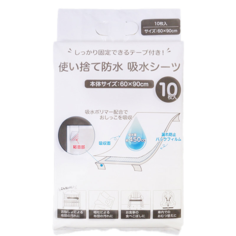 ●本体サイズ(cm):60×90 ●内容量:10枚入 ●組成表示:不織布、高分子吸収材、綿状パルプ、吸水紙、ポリエチレンフイルム、ホットメルト粘着剤 (使用上の注意)シーツの吸収面を上にして使用してください。・誤って口に入れたり、のどにつまらせることのないようにちゅういしてください。・火のそばで使用しないでください。洗濯はしないでください。使いまわしはおやめください。本品をハサミなどで切らないでください。凹凸のある場所に敷かないでください。また敷く場所に石やとがったものがおちていないか確かめてからご使用ください。汚れたシーツは早く取り替えてください。空き袋はお子様の手の届くところに置かないでください。商品の仕様は予告なく変更することがあります。 (保管上の注意)お子様や監督を必要とする方の手の届かないところにほかんしてください。開封後は、ほこりや虫が入らないよう、衛生的に保管してください。(使用後の注意)汚れた部分を内側にして丸めて、不衛星にならないように処理してください。使用後のシーツの廃棄方法は、お住まいの地域のルールに従ってください。