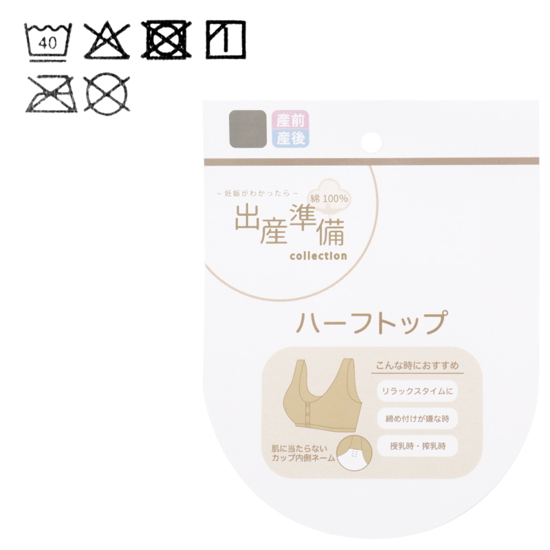 ●素材=綿 100% ●洗濯表示=液温は40度を限度とし洗濯機で弱い洗濯ができる。漂白処理はできない。タンブル乾燥禁止。日陰でのつり干しがよい。アイロン仕上げ処理はできない。ドライクリーニング処理はできない。 ●サイズスペック= M バスト 86~94 L バスト 93~101 ●対象期間=産前~産後