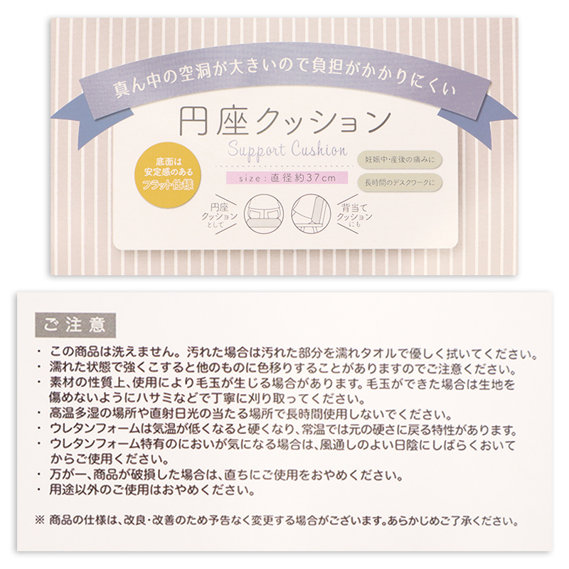 ●ご注意 ・この製品は洗えません。汚れた場合は汚れた部分を濡れタオルで優しく拭いてください。 ・濡れた状態で強くこすると他のものに色移りすることがありますのでご注意ください。 ・素材の特性上、使用により毛玉が生じる場合があります。毛玉ができた場合は生地を傷めないようにハサミなどで丁寧に刈り取ってください。 ・高温多湿の場所や直射日光の当たる場所で長時間使用しないでください。 ・ウレタンフォームは気温が低くなると硬くなり、常温では元の硬さに戻る特性があります。 ・ウレタンフォーム特有のにおいが気になる場合は、風通しのよい日陰にしばらくおいてからご使用ください。 ・万が一、商品が破損した場合は、直ちにご使用をおやめください。 ・用途以外のご使用はおやめください。 ※商品の仕様は、改良・改善のため予告なく変更する場合がございます。あらかじめご了承ください。