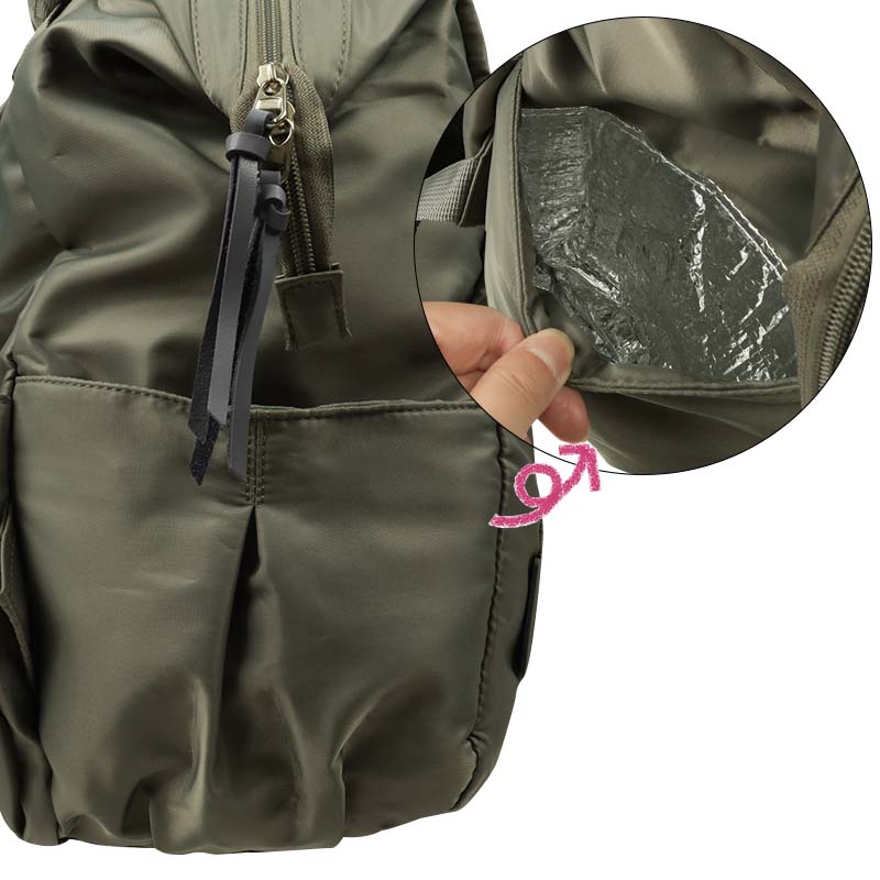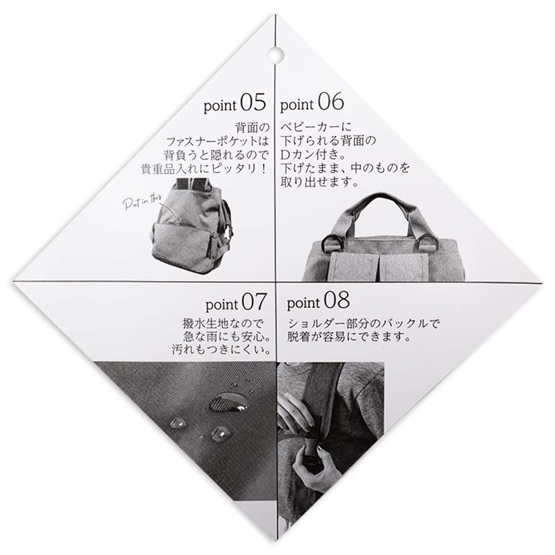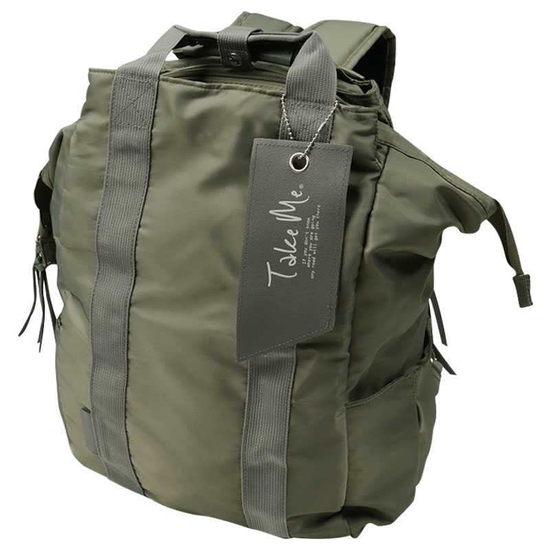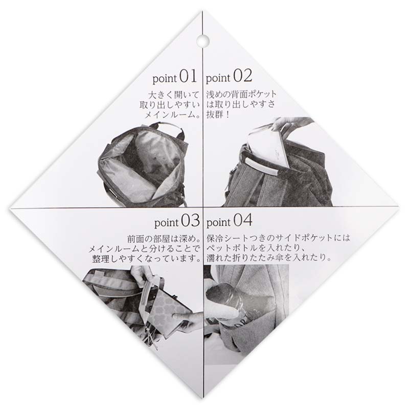 持ち物のカテゴリーを3つに仕分けできるので、どなたでも整理しやすく、収納できます。 両手が空くリュックは、マザーズバッグとして、通勤、通学、旅行にと、とっても便利。 ガバっと大きく開くメインルームは、大きいものでも入れやすく出しやすい。メインルームには背面のサイドにもファスナーがあり、背負ったまま中身を取り出すことができます。 背面にファスナー付きのポケットがあるので、お財布やスマホなどの貴重品を入れられます。 よく使うものなのに、一旦荷物を下ろしてバックを開けて・・・は面倒。背負ったまま取り出せるからとっても便利。 また、takemeシリーズ定番のタグが今回も付属。 カードケースになっていて、いちいち取り出すのが面倒なよく使うカードを収納できます。 雨をはじきやすい撥水生地を使用しているので、汚れもつきにくくお手入れしやすい。