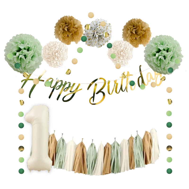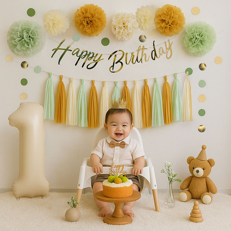 \アカチャンホンポ限定/ 1歳のお祝いを華やかに演出する、フローラルデコレーションセット。 お子様の大切な1歳の誕生日を華やかに演出するためにデザインされた、 男女問わずお使いいただける爽やかなセットです。 くすみグリーンをメインにしたペーパーフラワーのデコレーション、 華やかなタッセルガーランド、そして約70cmの数字の1のフィルムバルーンが含まれており、 1歳のお祝いにぴったりなアイテムが揃っています。 (c) 2025 masu masu,Inc.