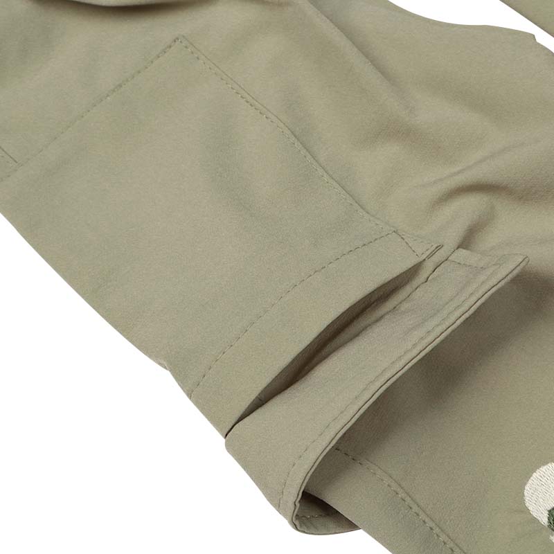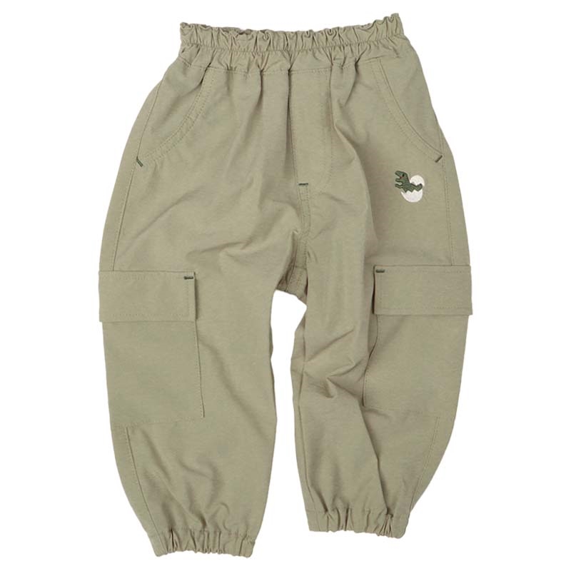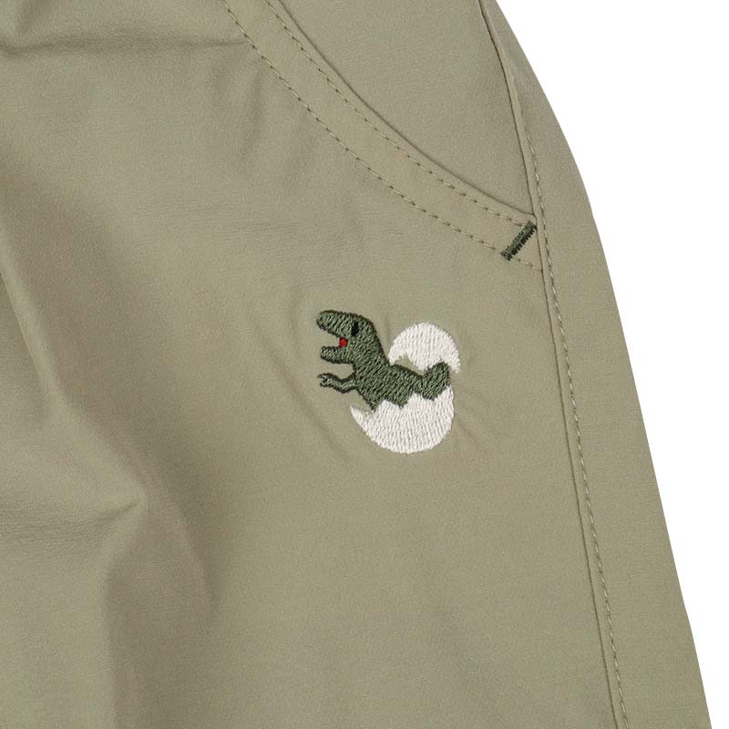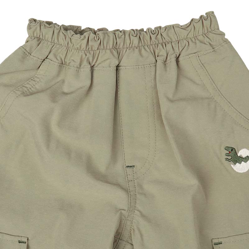 恐竜のワンポイント刺繍入りです。ウエストゴムで着脱しやすい仕様となっています。