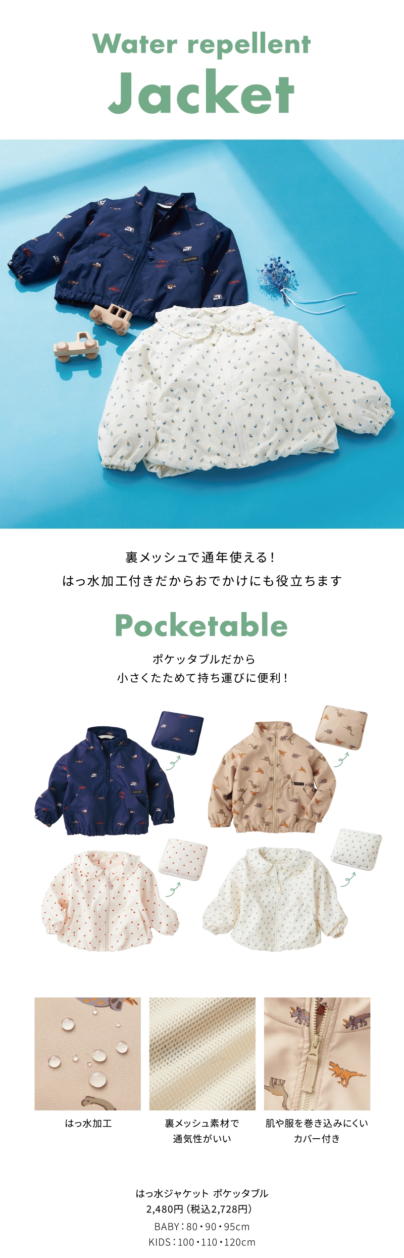 素材 ポリエステルタフタ ポリエステル100% 裏地 ポリエステルメッシュ ポリエステル100% サイズ 100/110/120 身丈 40/43/46 身巾37/39/41 袖丈 32/35.5/39