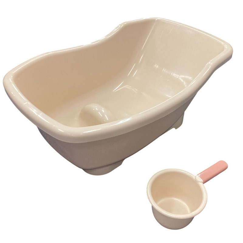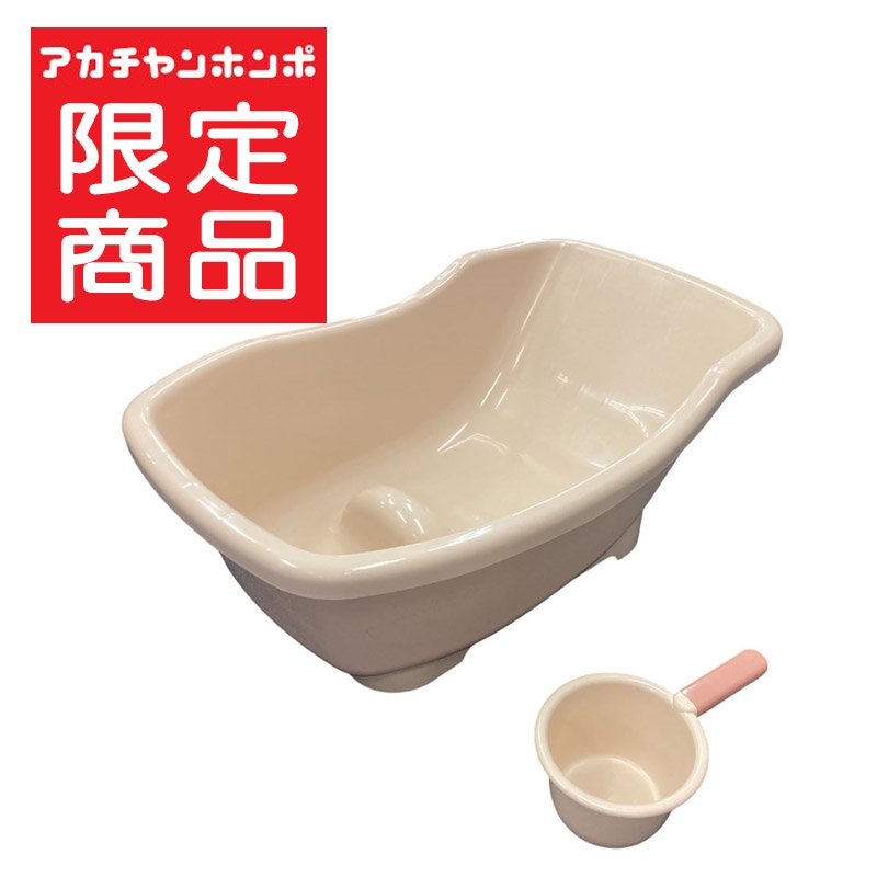 ベビーバス ●本体:ポリプロピレン 排水栓:熱可塑性エラストマー(耐熱温度:80℃) ●商品サイズ(約・cm):奥行40(底面30)×横幅60×高さ23(足元部分20) シンクに入れる場合の必要サイズ:幅60cm以上×奥行40cm以上×高さ20cm以下 ●容量:約19リットル ●対象月齢:新生児~6ヵ月頃まで 手おけ ●本体:ポリプロピレン ●ハンドル:ポリエチレン(耐熱温度:80℃) ●商品サイズ(cm):20.5×12.8×(高さ)8