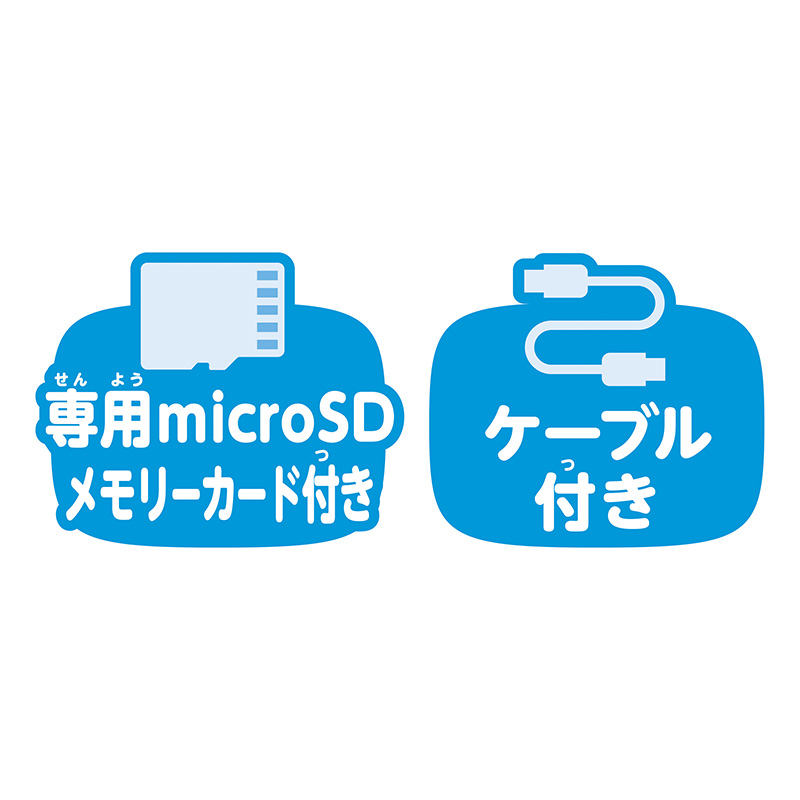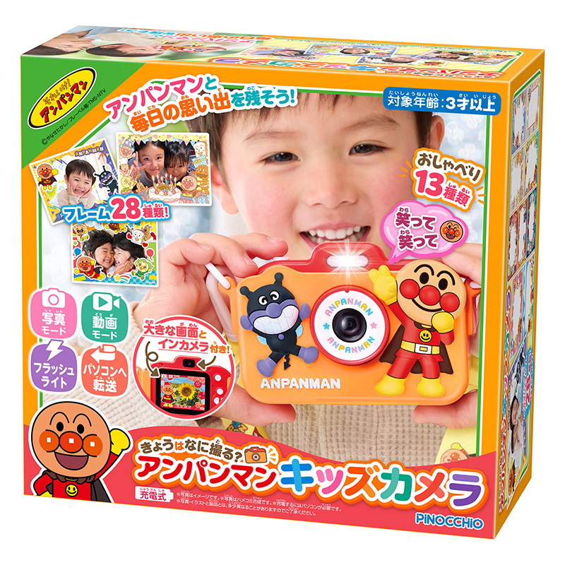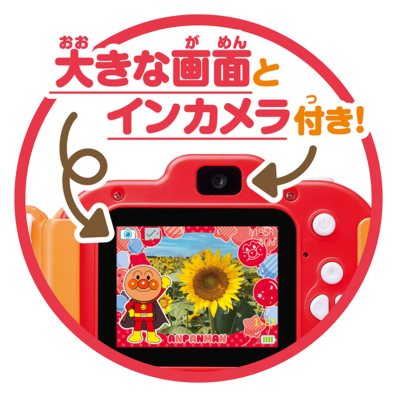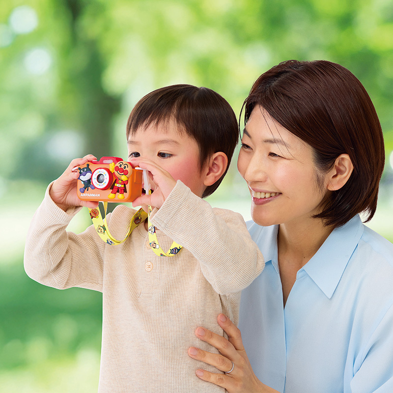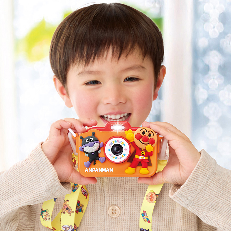 シリコン素材のカバーが付いており、手なじみが良く、 またストラップが付いているため、首にかけて持ち運びができます。 アンパンマンのおしゃべり13種入り。 遊びを盛り上げます。写真撮影は8倍のズーム、イン・アウトカメラ切替、 フラッシュライトなど様々な機能が付いています。 28種のアンパンマンデザインフレームを使って写真撮影が楽しめます。 動画撮影はイン・アウトカメラ切替やスロー撮影、こま撮りなど様々な撮影が楽しめます。 付属のケーブルを使って、撮った写真、動画をパソコンに転送することができます。 子どもの撮った写真を見ることで、子どもの視点を知ることができ、 親子のコミュニケーション活性につながります。