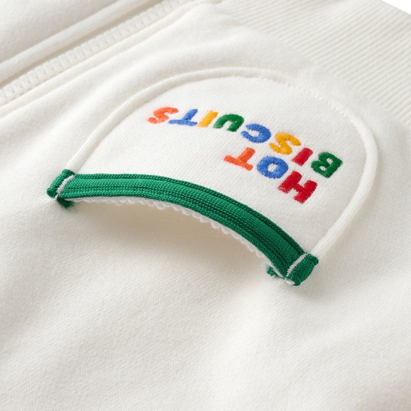 胸元のビーンズのワッペンやポケットのロゴ刺繍がさらにホットビスケッツらしさを引き立てます。
