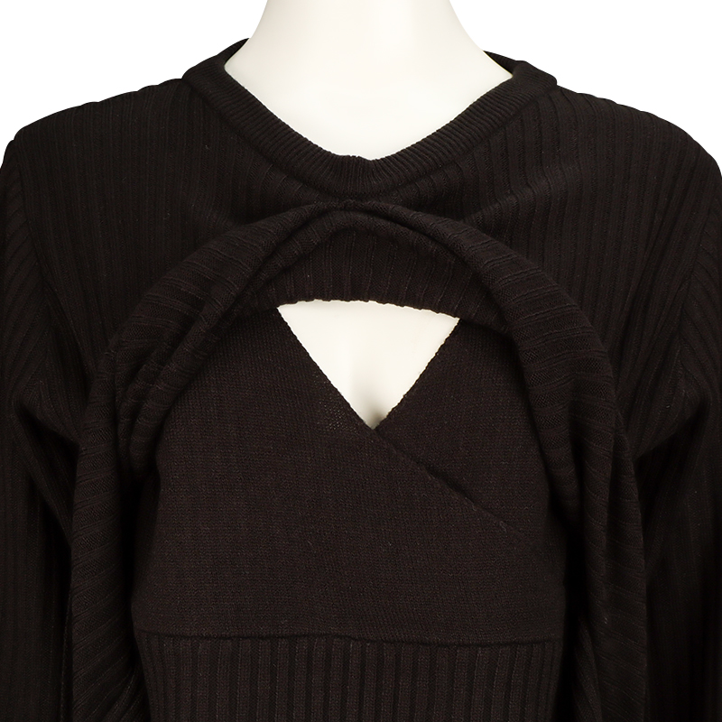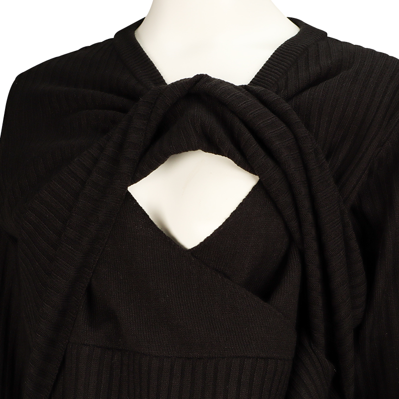 ネットに入れて、洗濯機で洗える、リブニット素材の長袖ワンピースとなります。 前身ごろをめくると、クロスオープンタイプの授乳口が付いております。 後着丈は、現状売れている、長めの丈になっております。 裾の両脇に、スリットが入っています。
