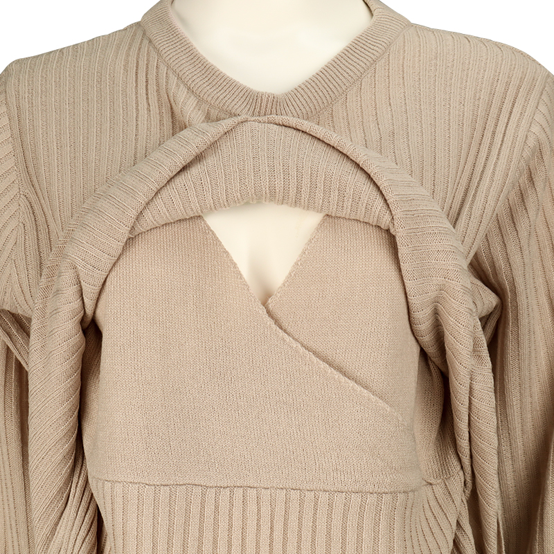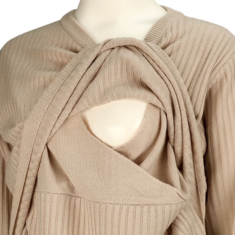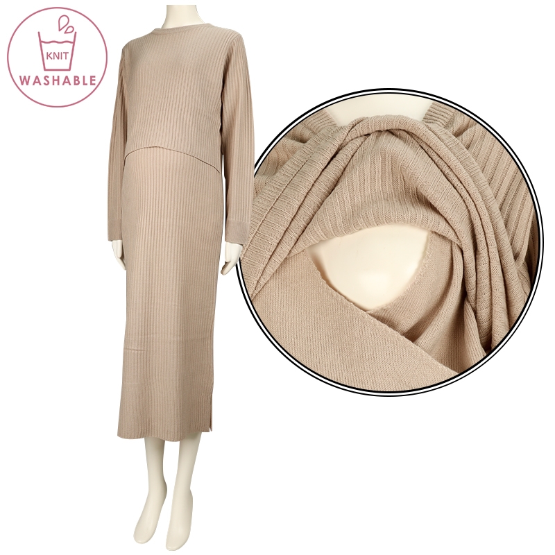 ネットに入れて、洗濯機で洗える、リブニット素材の長袖ワンピースとなります。 前身ごろをめくると、クロスオープンタイプの授乳口が付いております。 後着丈は、現状売れている、長めの丈になっております。 裾の両脇に、スリットが入っています。