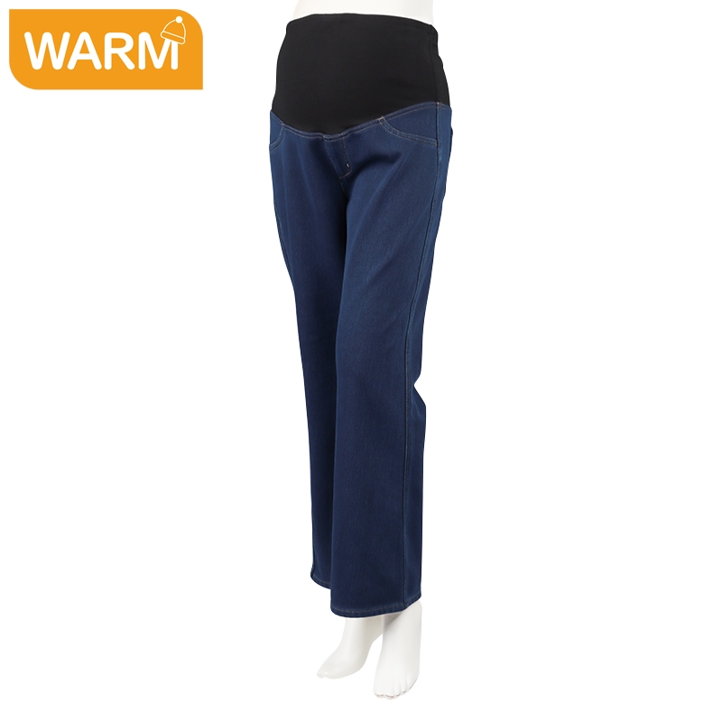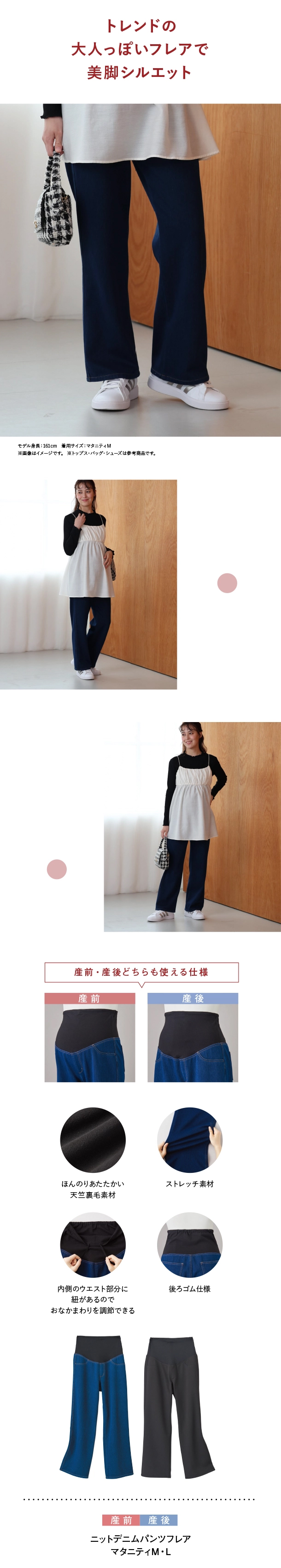 よく伸びるニットデニム素材、裏側がふんわり起毛していて暖かく、ほどよい厚みで着膨れしない。 ゆとりのあるワイドフレアシルエット。 おなか周りはやわらかくて伸びる別素材を使用し、お腹周りにやさしく履き心地も気持ちいいパンツです。