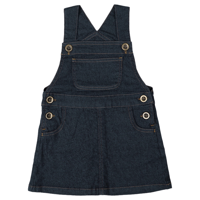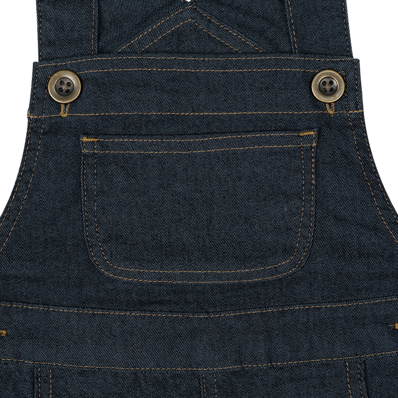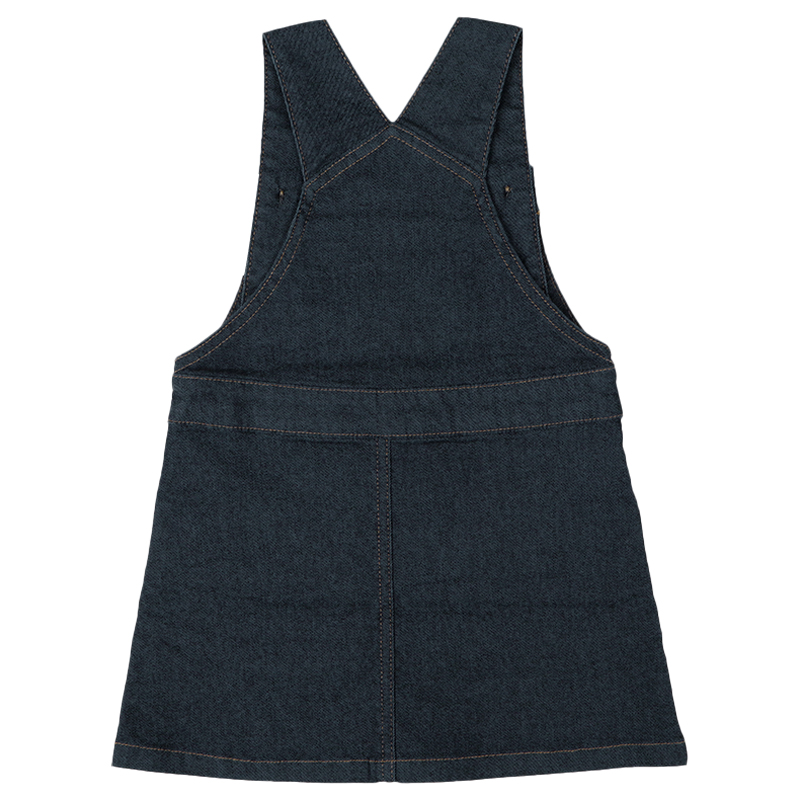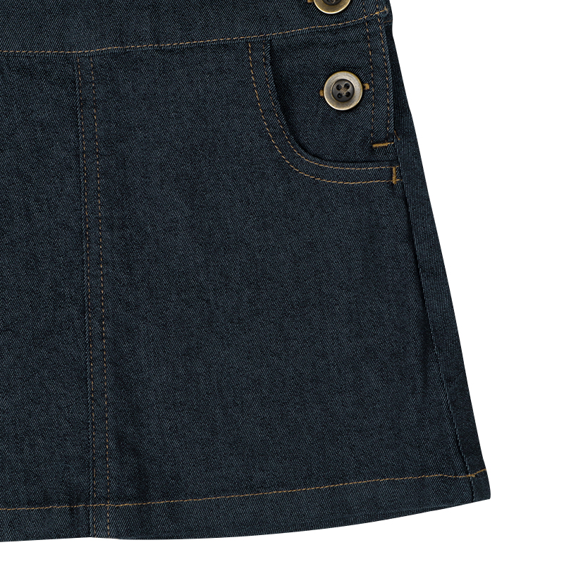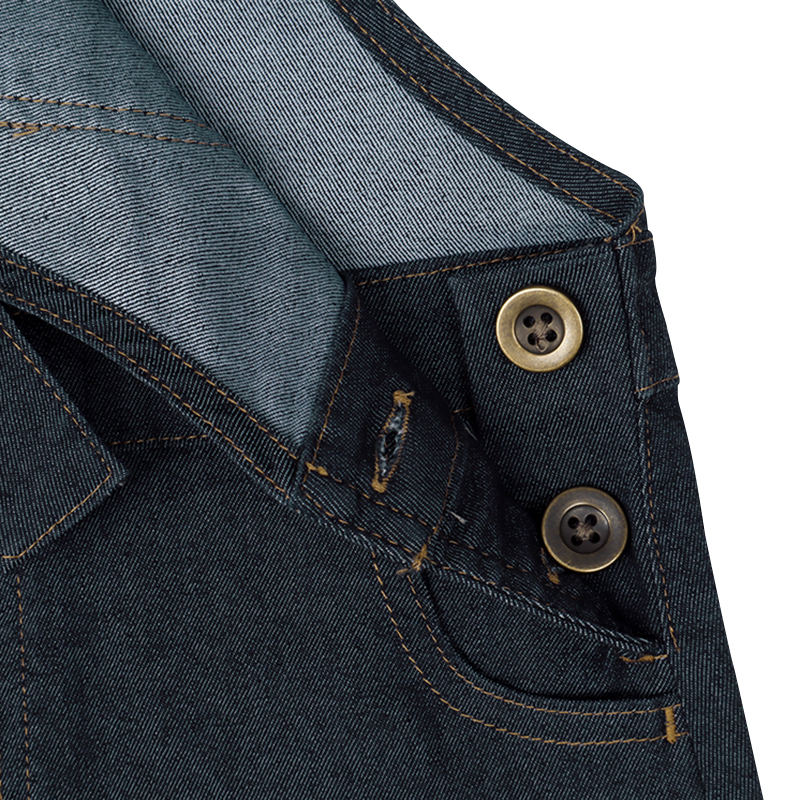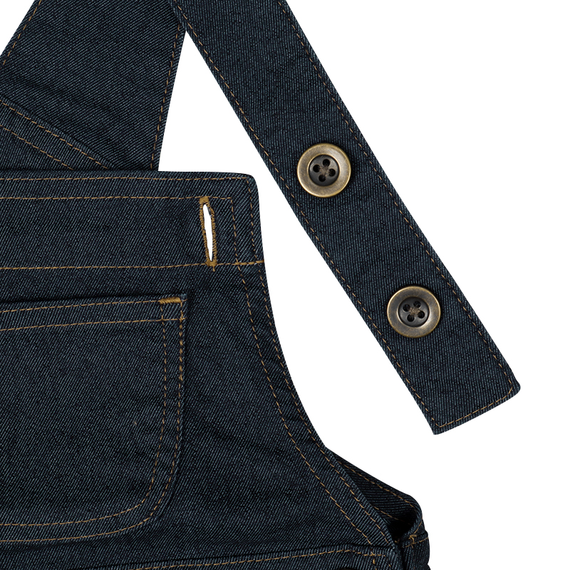 ●素材=[ツイル反応染]綿70%ポリエステル27%ポリウレタン3% ●寸法(約・センチ)= [70センチ]ウエスト54・身丈41・胸当て丈15・スカート丈17 [80センチ]ウエスト56・身丈44・胸当て丈15.5・スカート丈19 [90センチ]ウエスト58・身丈47・胸当て丈16・スカート丈21 [95センチ]ウエスト60・身丈50・胸当て丈16.5・スカート丈23