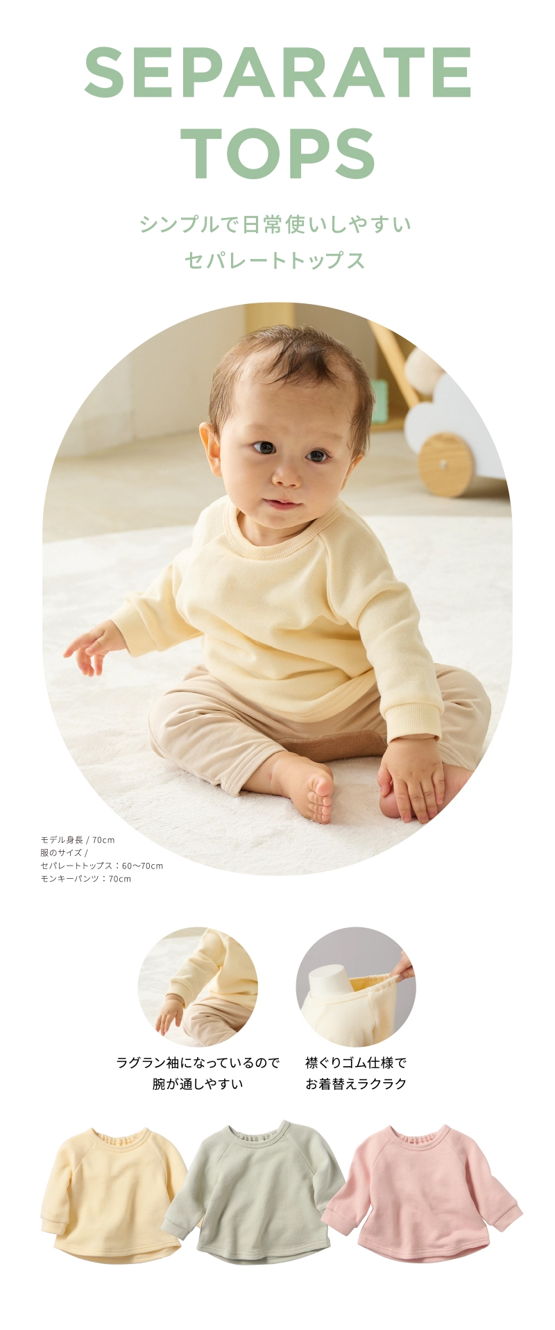 ・組成 本体 綿100% リブ部分 綿95% ポリウレタン5% ・スペック 60-70サイズ 総丈31cm 胸幅30cm 袖丈27.5cm 70-80サイズ 総丈34cm 胸幅31cm 袖丈32cm