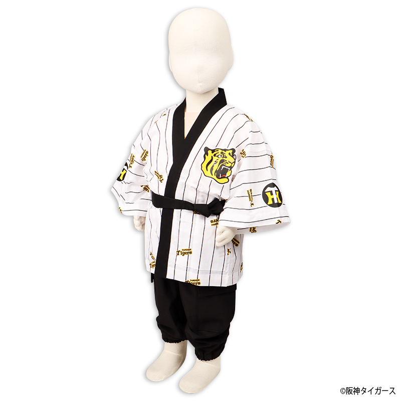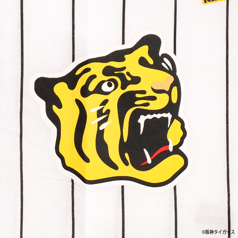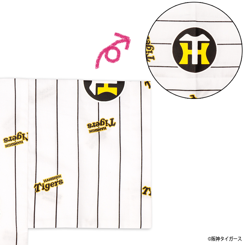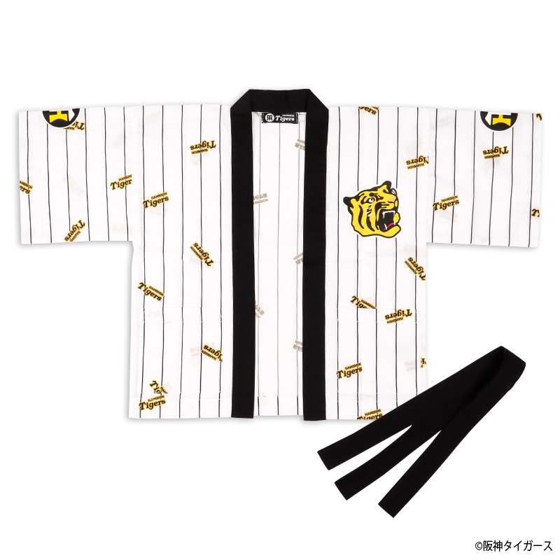 阪神タイガースの総柄プリントの法被です。総柄のロゴプリントがおしゃれな夏にピッタリな1枚です。涼しい綿100%素材。