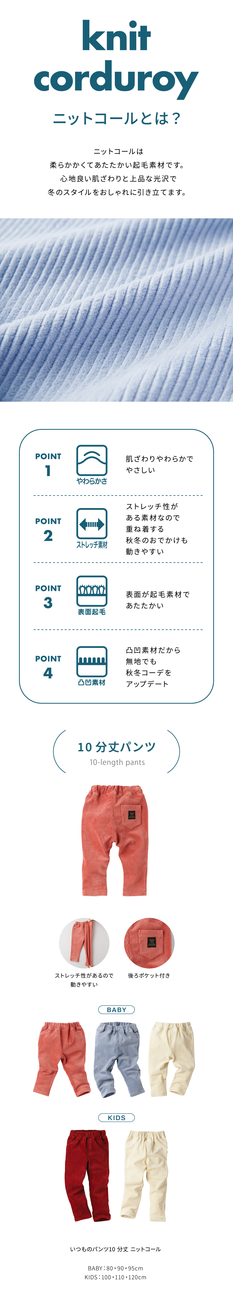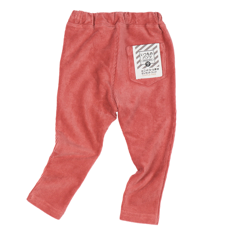 縦ウネの表面感と、柔らかさが特徴的なニットコール素材を使用したロングパンツ シンプルな形でどんな服にも合わせやすいので、毎日でも履きたくなるパンツです。 総ゴム仕様のウエストなので着脱も簡単に行えます。 園でも使える名前ネーム付きです。
