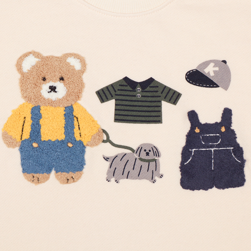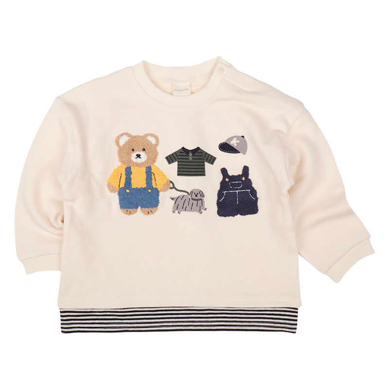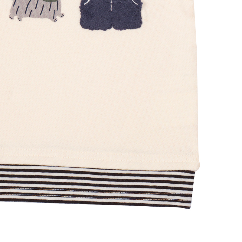 ベビーサイズは着脱しやすい園でも便利な肩開き仕様です。 前身頃の刺繍は立体のサガラ刺繍を使用しました。 形はシンプルでどんなボトムにも合わせやすく、何枚持っていてもあきないトレーナーです。 園でも使える名前ネーム付き。