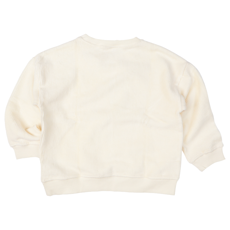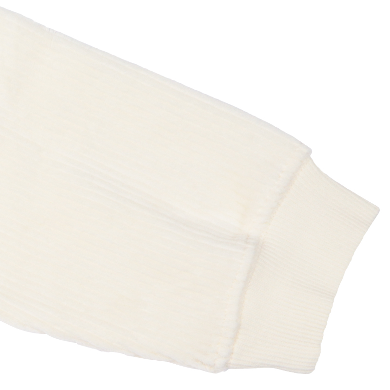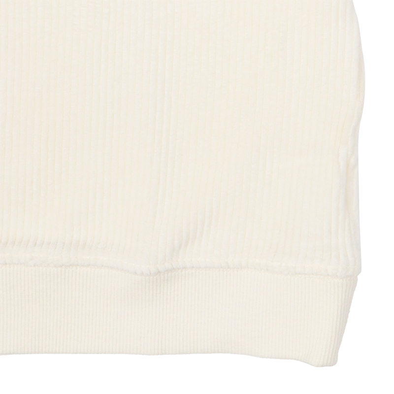 縦ウネの表面感と、柔らかさが特徴的なニットコール素材を使用したトレーナー ベビーサイズは着脱しやすい肩開き仕様です。 形はシンプルで衿ぐり・袖口・裾口にリブを使用したしっかり仕様。 どんなボトムにも合わせやすい、何枚持っていてもあきないトレーナーです。 園でも使える名前ネーム付き。