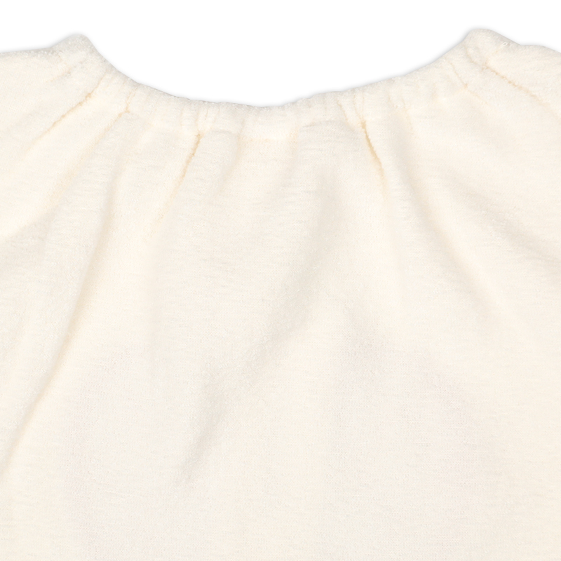 空気を含み、柔らかく、ふんわりした風合いを持っている生地を使用しているので シルエットもゆったりで生地も柔らかく、着心地も良いので元気いっぱいのお子さんにぴったりです。 前身頃の大きなアップリケ刺繍がポイントです。 便利な名前ネーム付きです。
