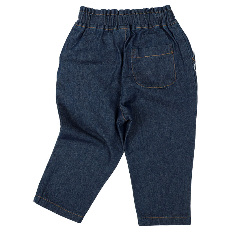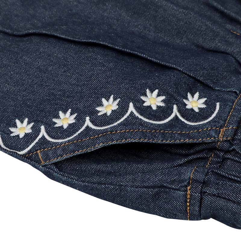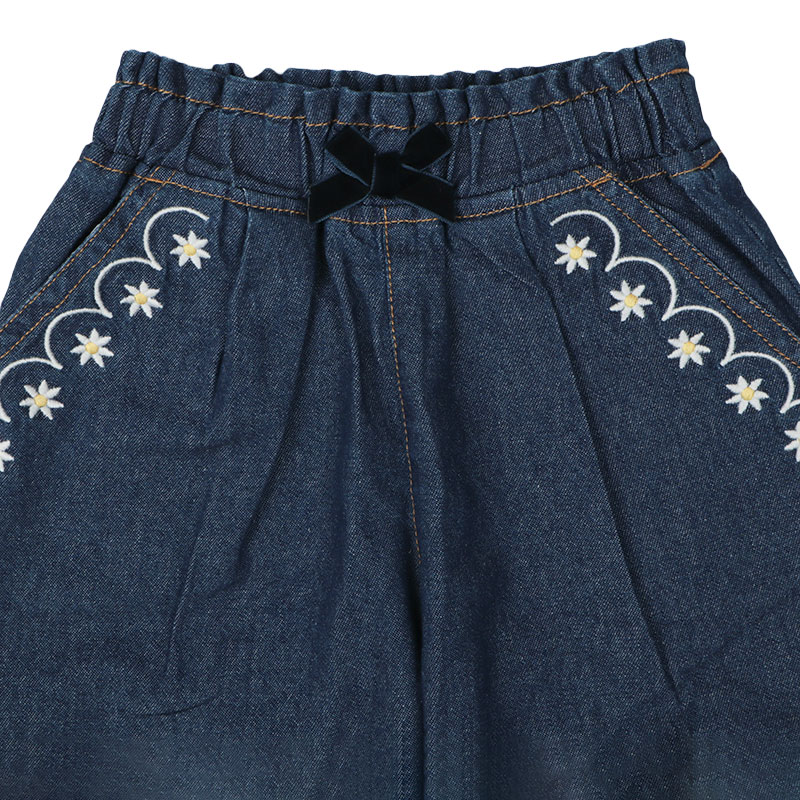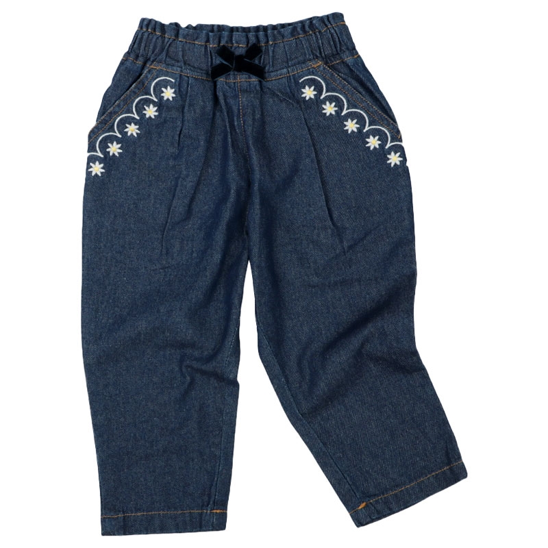 ウエストのフリルとリボンがポイントの女の子らしいデニムパンツ。 ポケット口にはお花とスカラップの刺繍をあしらい、ガーリーなアクセントに。 程よいゆとりのあるテーパードシルエットで動きやすく、デイリー使いにもぴったり。 軽いデニム素材で履き心地も快適。 トップスをインしたスタイルでウエストデザインを見せる着こなしもおすすめ
