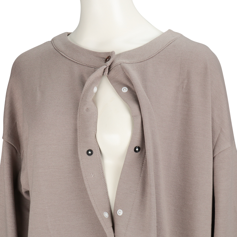 裾のボタンを留めると、就寝時に裾がまくり上がらない、長袖ワンピースとなります。 素材は、ストレッチ裏毛です。 前身のボタンを開けて、授乳するタイプになります。 ハンカチやスマホが入れれる、便利なポケットが両脇に付いております。