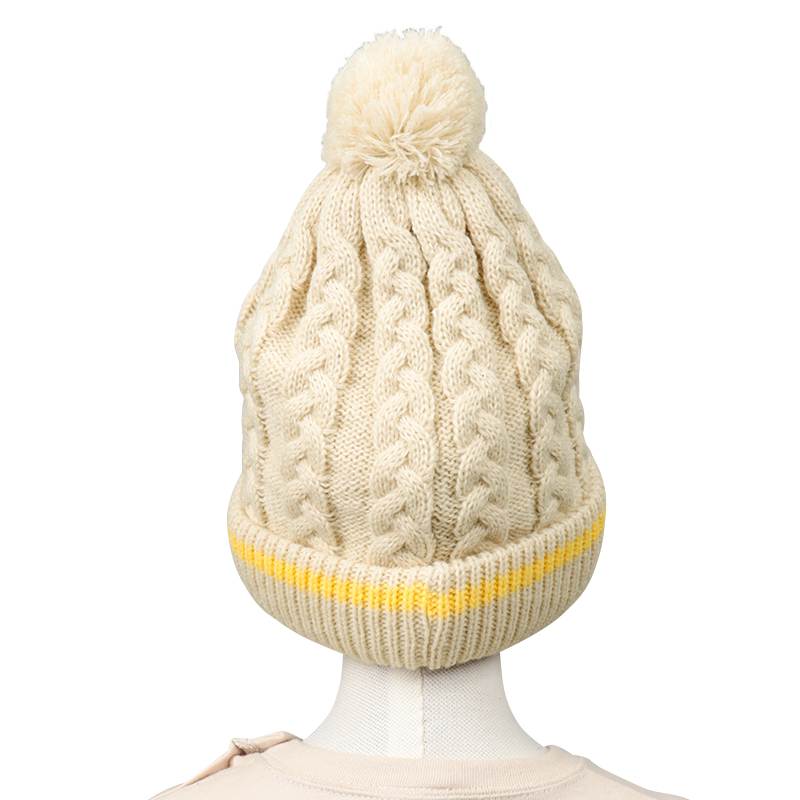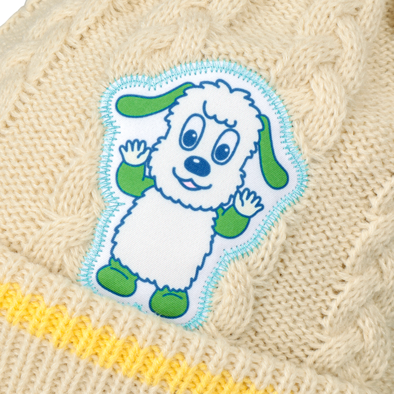 ワンワンのワッペンが可愛らしい、あたたかなケーブル編のニット帽子です。 シンプルだけど飽きのこないデザインで、伸縮性にも優れているので、寒い日のお出かけには毎回着用したくなります。 リブ部分のラインの配色もとってもおしゃれ。ワンワンと一緒におでかけしましょう。