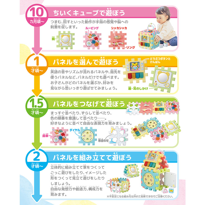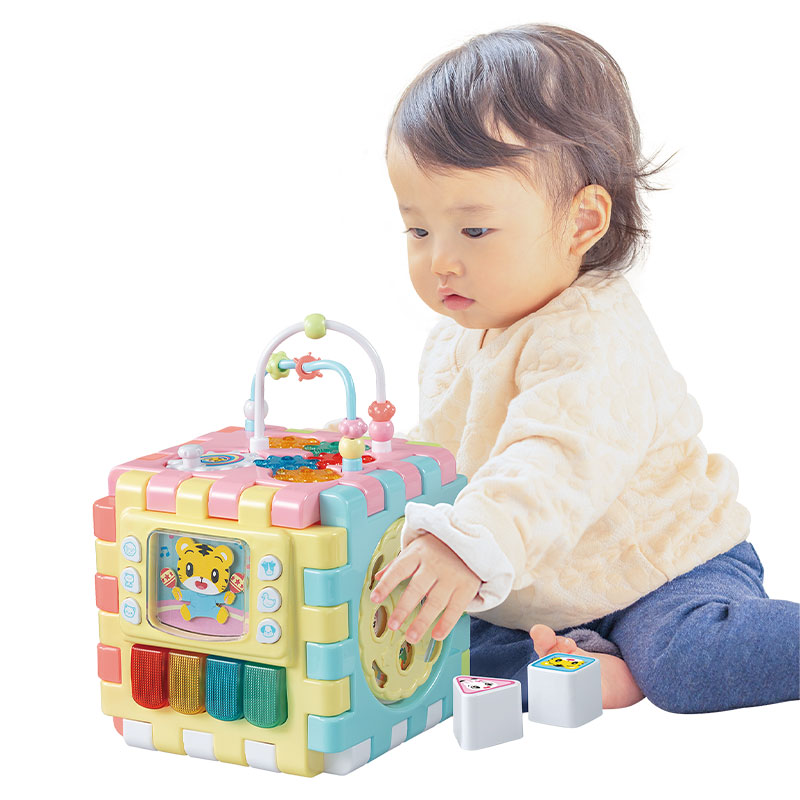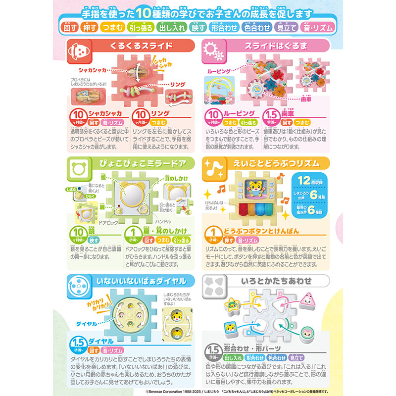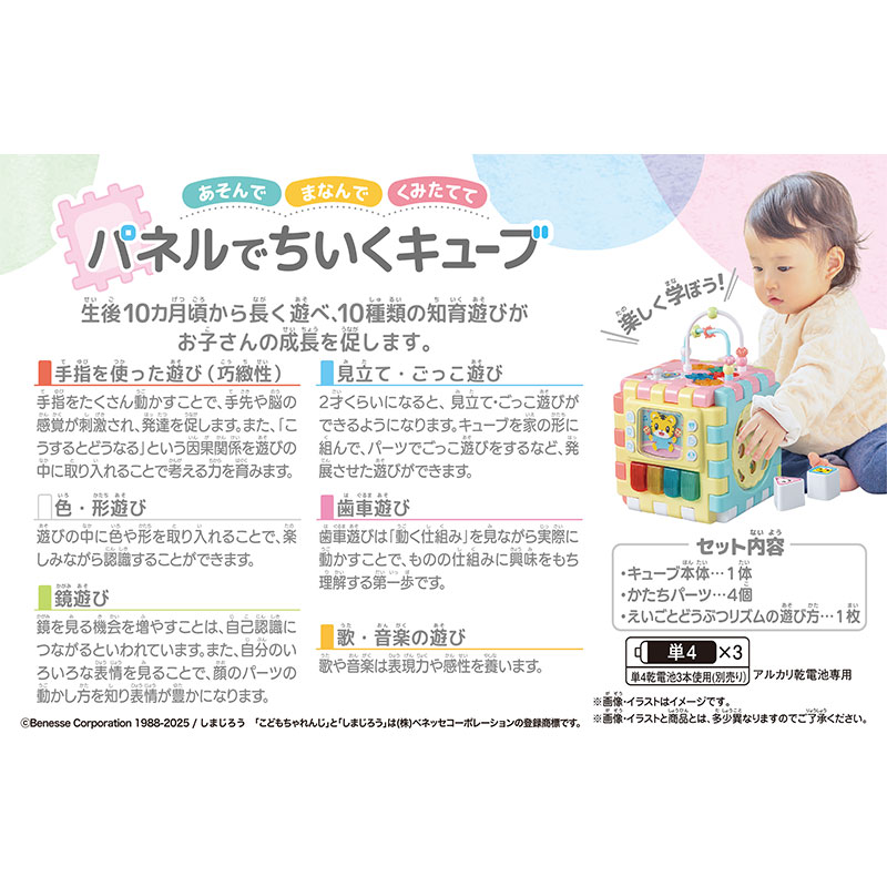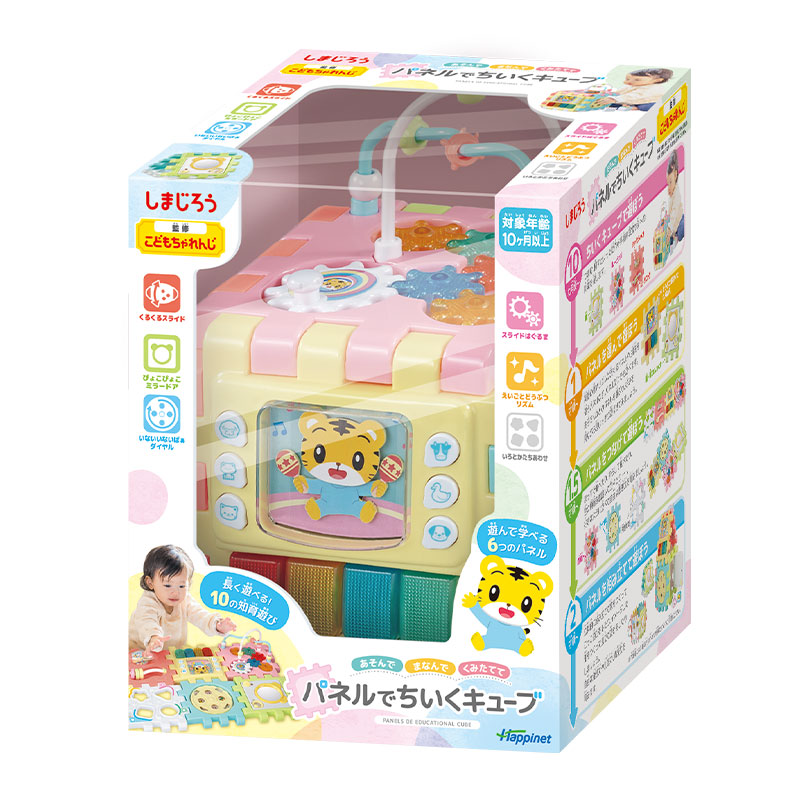 並べたり組み立てたり、お気に入りのパネルだけを持ち運ぶこともできるちいくキューブ。 6つの異なるパネルで、手や指を使った10種の学びが 10か月~2歳まで長く、遊びながら身に付きます。 えいごとどうぶつリズムのパネルでは、お馴染みの童謡10曲、 しまじろう代表曲2曲の全12曲を収録。 さらに、しまじろうの英語音声が6種類・どうぶつの鳴き声6種類も収録されています。