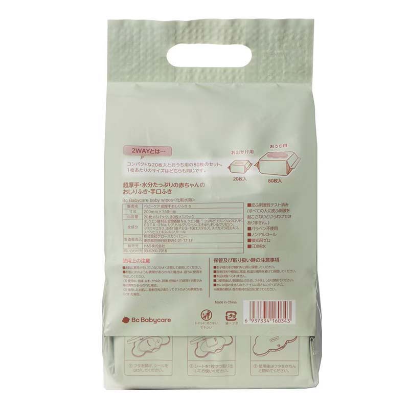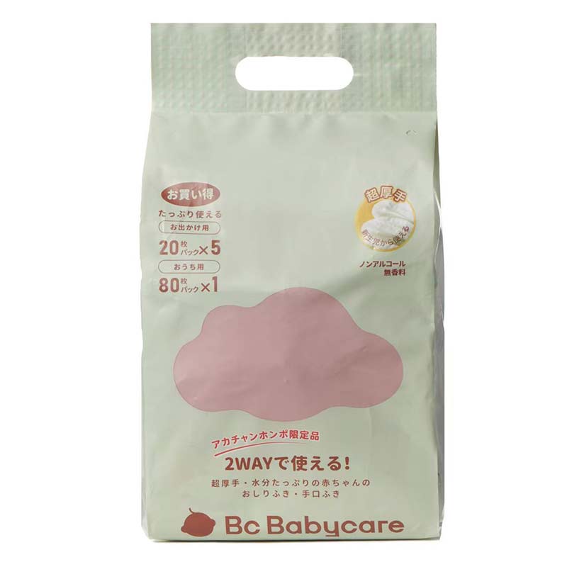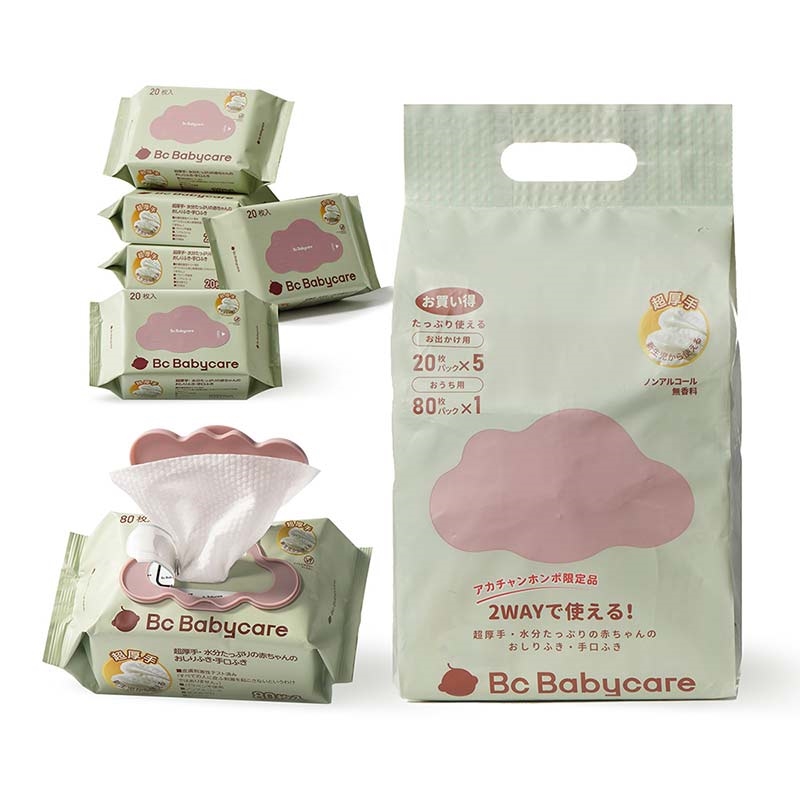 デリケートな赤ちゃんのお肌を守る。 超厚手・水分たっぷりの赤ちゃんのおしりふき・手口ふき 厚さ、大きさ、水分量、シートの形状。発売以来改良しつづけ、すべての面において高レベルで完成した Bc Babycareの自信作が超厚手・水分たっぷりの赤ちゃんのおしりふき・手口ふきです。 1枚でもきれいにできてママ・パパの手も汚れににくい。 こだわりのパッケージで乾きにくく衛生的 洗い流すようにふけてデリケートな肌にもやさしい お口まわり・体にも使えて便利。 ●お肌に異常が生じていないか、よく注意して流さご使用ください。使用中、又は使用したお肌に直射日光があたって、赤み・はれ・かゆみ・刺激・色抜け(白斑等)や黒ずみ等の異常が現れた場合は、使用を中止し、皮フ科専門医などへご相談ください。そのまま使用を続けますと症状が悪化することがあります。 ●眼や粘膜および傷口には使用しないでください。 ●中身の乾燥を防ぐため、使用後はしっかりとシールを閉め、なるべく早めにご使用ください。 ●乳幼児の手の届かないところに保管してください。 ●お子様に配慮した成分を使用しておりますが、使用に際しては、お子様の誤飲・誤食にご注意ください。 ●直射日光のあたる場所や、高温の場所には保管しないでください。 ●水に溶けませんので、トイレに流さないでください。