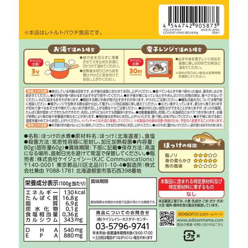 ●対象月齢:1.5歳頃~ ●名称:ほっけの水煮 ●原材料:ほっけ(北海道産)、食塩 ●内容量:80g(固形量60g) ●保存上の注意 高温になる場所、直射日光を避けて常温で保管してください。
