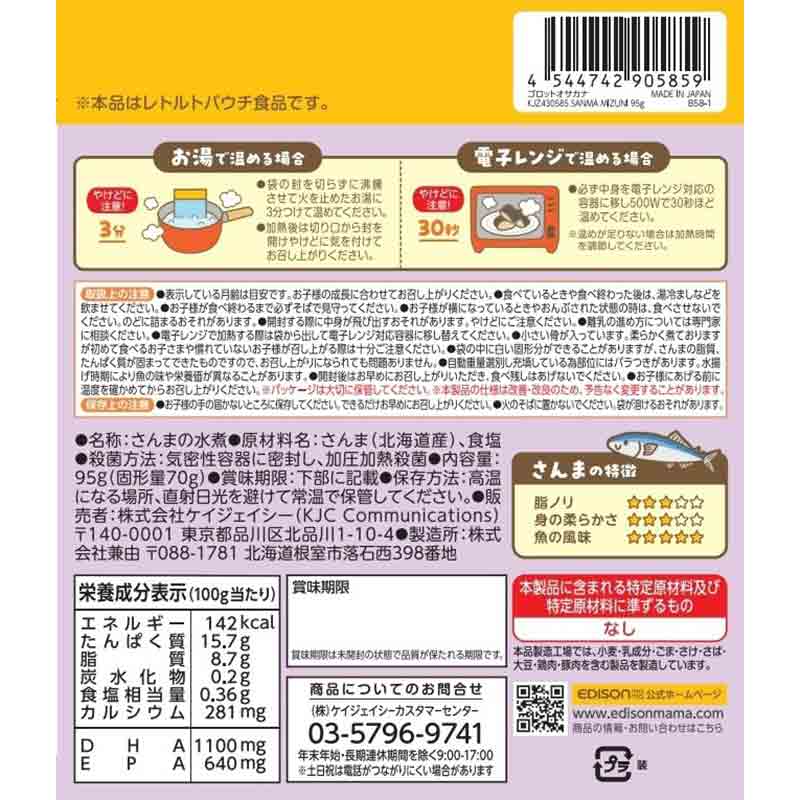 ●対象月齢:1.5歳頃~ ●名称:さんまの水煮 ●原材料:さんま(北海道産)、食塩 ●内容量:95g(固形量70g) ●保存上の注意 高温になる場所、直射日光を避けて常温で保管してください。