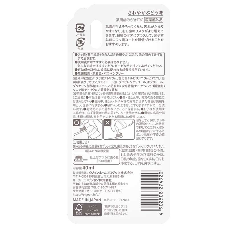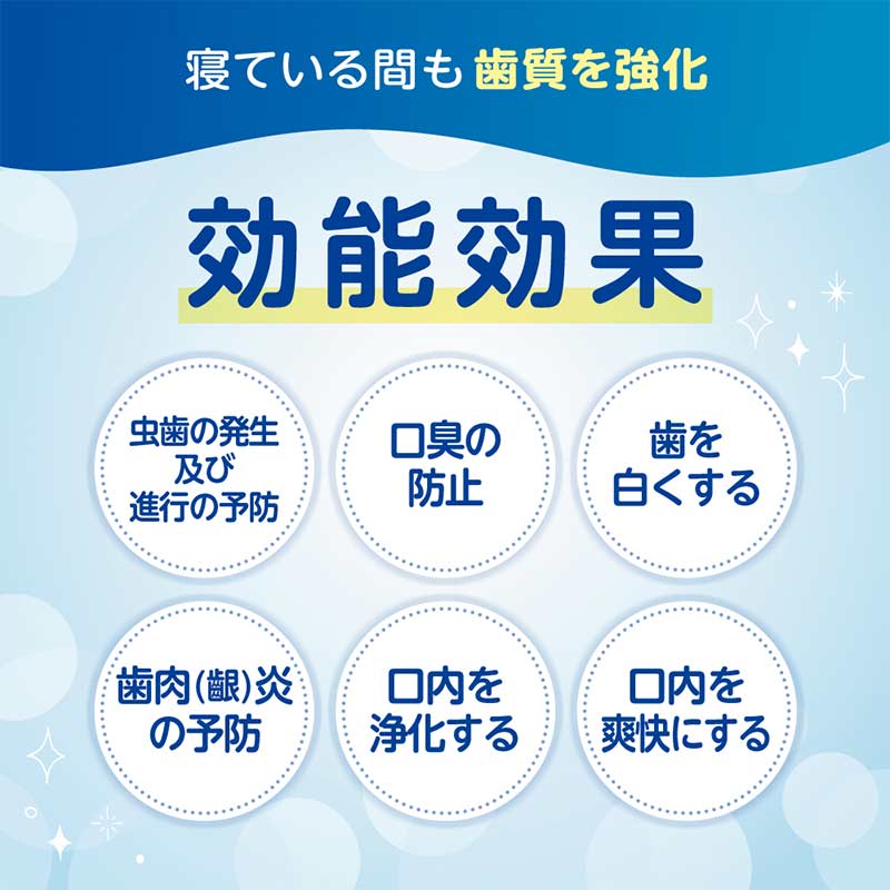●使用量の目安:1日のフッ素使用基準量を超えないよう1日1回までの使用とする。 歯みがきの後に適量を歯ブラシにとり、歯及び歯ぐきをブラッシングしてください。 ●1回あたりの目安:仕上げブラシに乗る量(15㎜程度) ●効能効果: 歯肉(齦)炎の予防。 むし歯の発生及び進行の予防。 口臭の防止。 歯を白くする。 口内を浄化する。 口内を爽快にする。