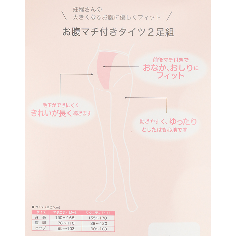 前後マチ付きで、妊娠中のサイズ変化の大きいおなか、おしりにフィットします。 動きやすく、ゆったりしたフィット感でやさしいはき心地です。 毛玉ができにくく、きれいが長く続きます。 妊婦さんの冷え対策におすすめです。