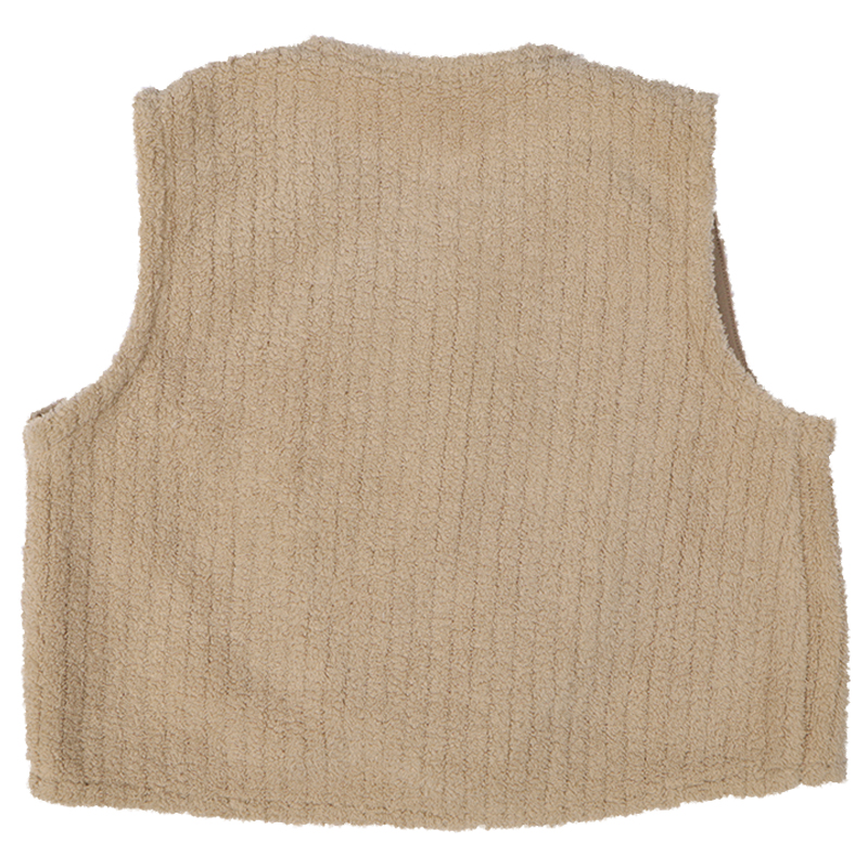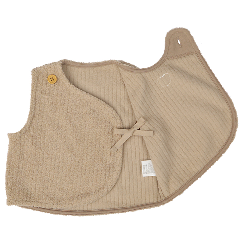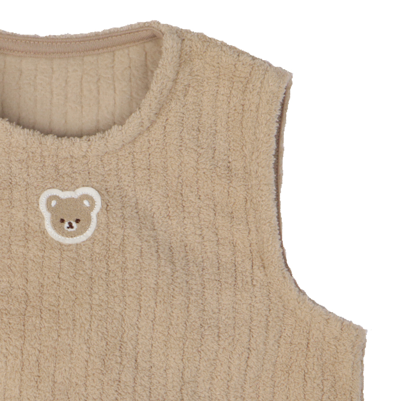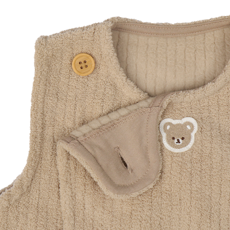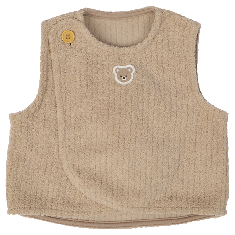 ふんわりとしたフリース素材を使用したベストです。 フリース素材は軽くて保温性に優れている為、動き回る赤ちゃんの邪魔にならず、しっかる体をあたためてくれます。 お部屋での体温調整や湯冷め防止、お出かけ時の防寒対策にもサッと羽織れる温度調整アイテムとして持っておくとデイリーに大活躍です。