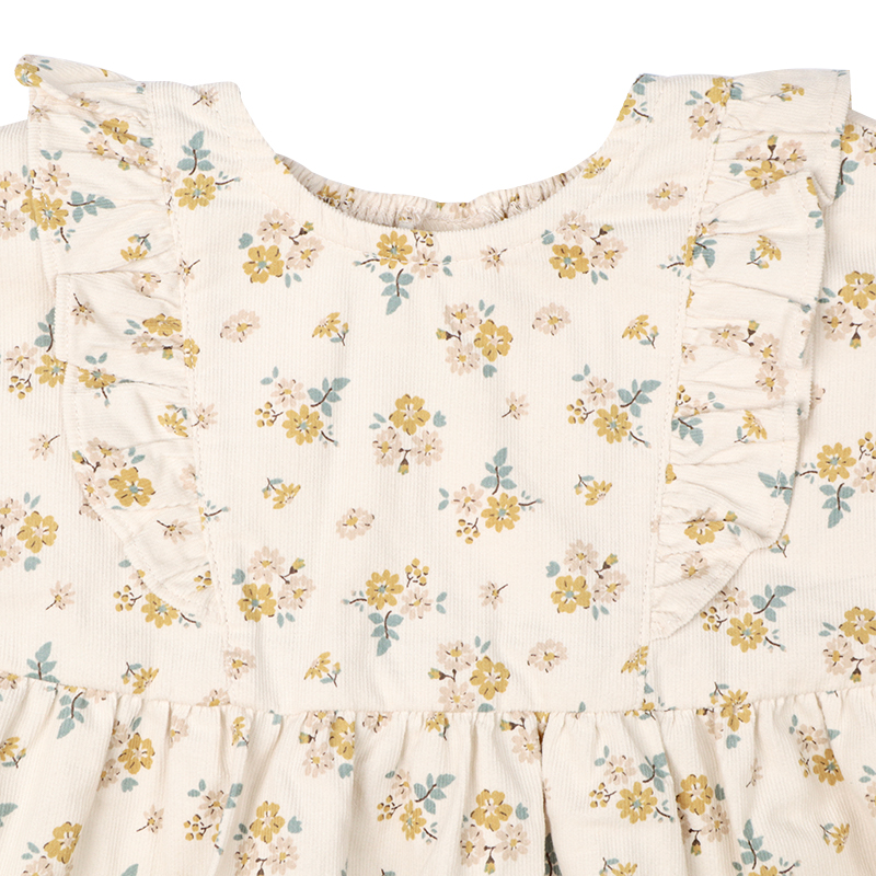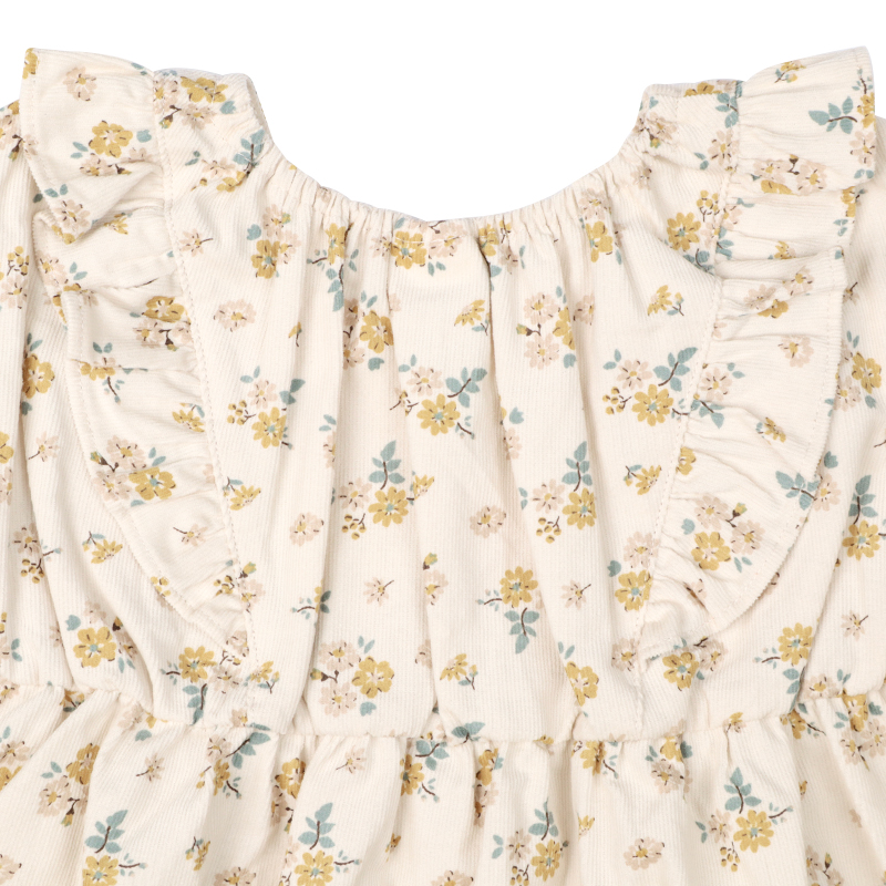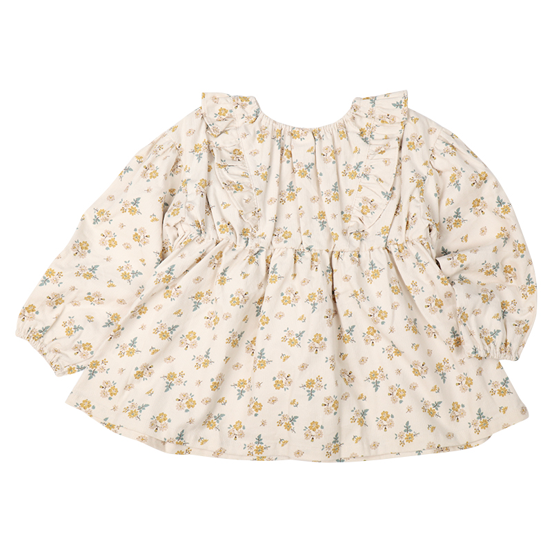 軽くてやわらかいシャツコール素材を使用した、お上品なチュニックです。繊細な小花柄プリントがほどこされています。肩フリルと切り替え部分のギャザーがアクセント。首回りは後ろゴムで着脱しやすい仕様となっています。