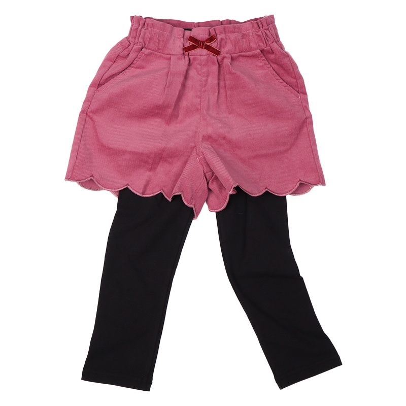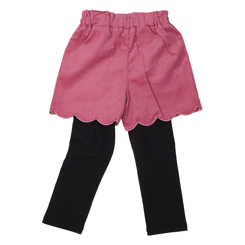 パンツ部分はやわらかいコーデュロイ素材、レギンス部分は動きやすいベア天竺素材です。 パンツのスカラップ仕様がアクセントになっています。 秋冬でもあたたかくスカートコーデを楽しんでいただけるアイテム。 通園や通学にはもちろん、お出かけ着としてもおすすめです。