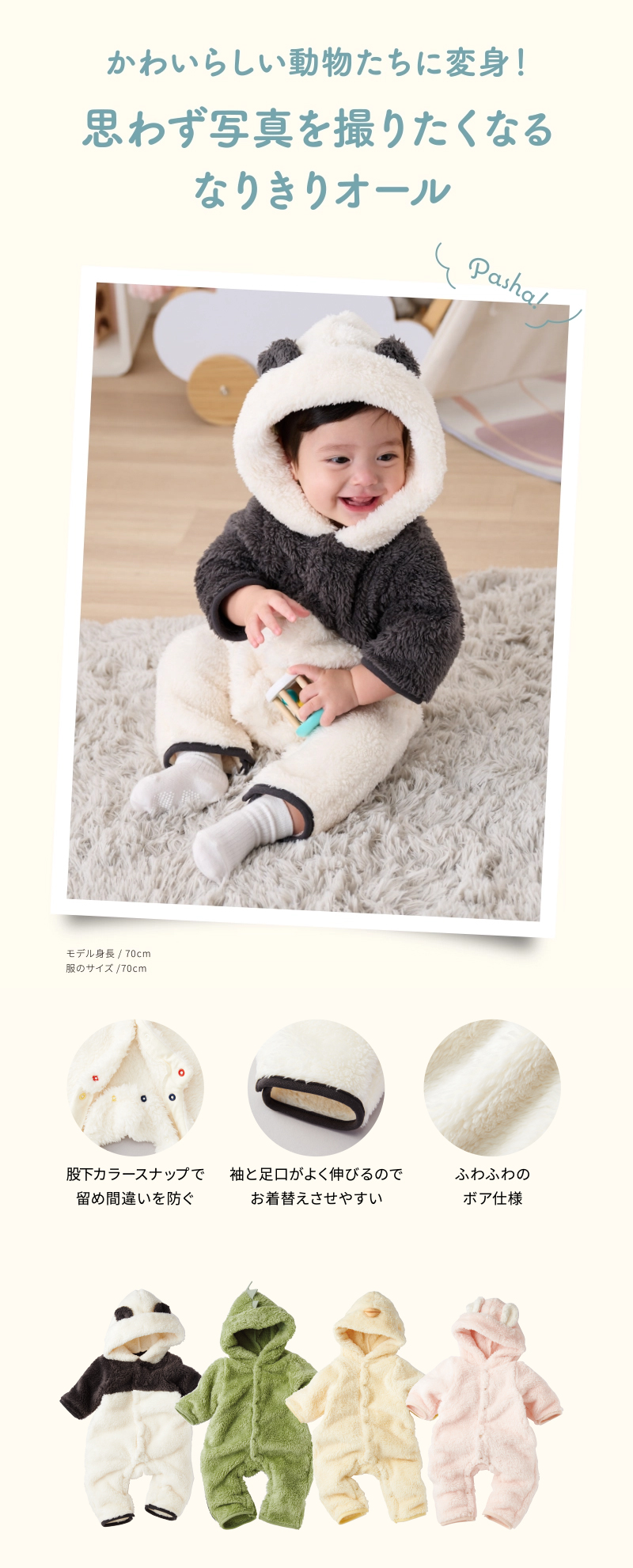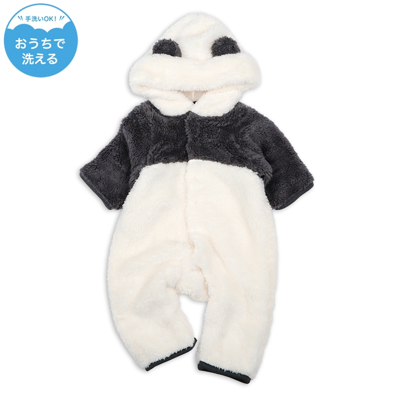見た目も着心地も暖かくプレオールです。 思わず触りたくなるふんわりとした心地のよい生地を使用しています。 フードを被ると動物になりきれるかわいいデザインに仕上げました。 お出掛けの時に着せたくなる1着です。