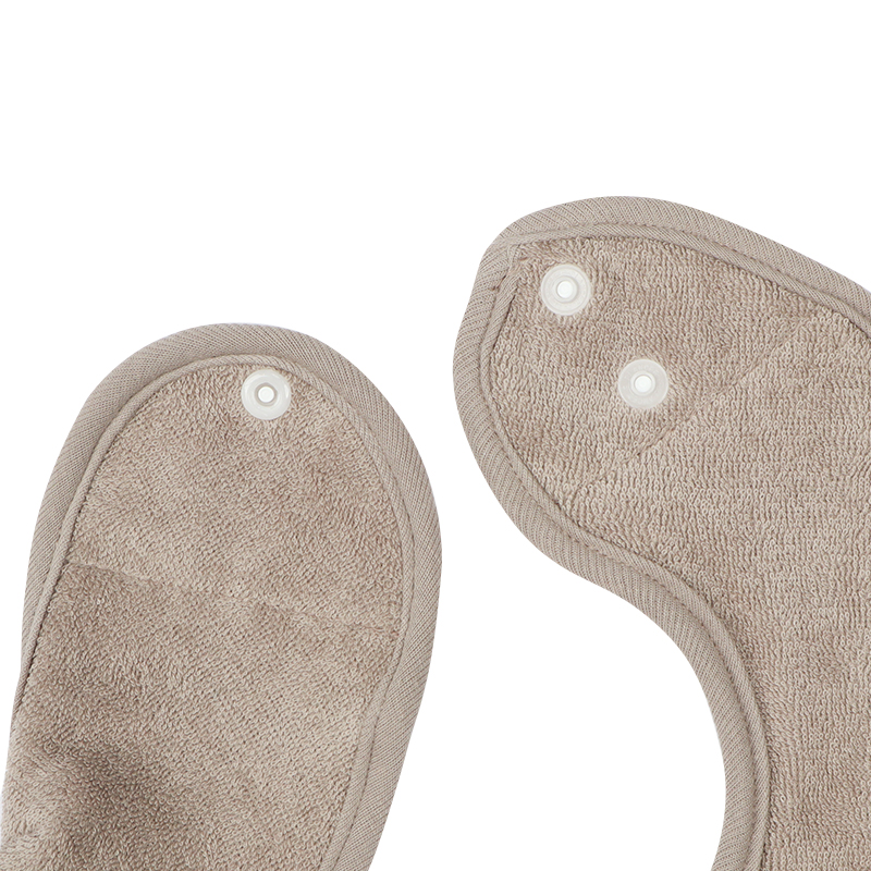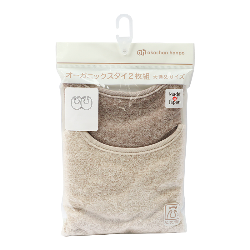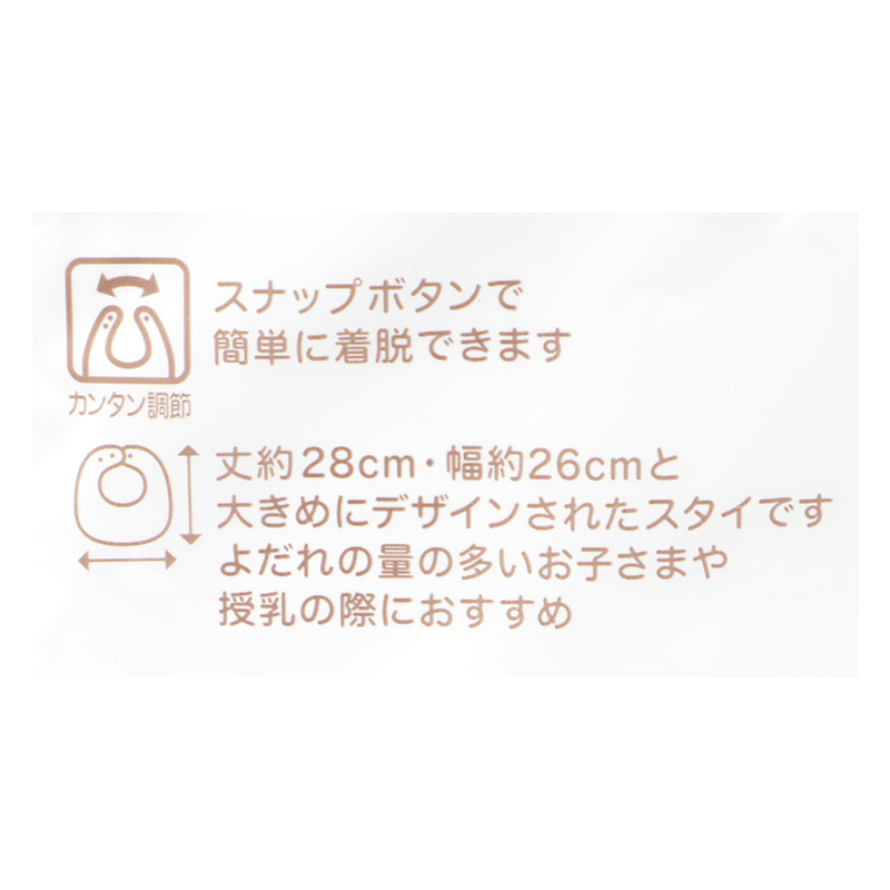 大きめサイズで首回りをしっかりカバーするスタイです。 綿100%で心地よい肌触りのやわらかなオーガニックパイル生地を使用しています。 首元はスナップボタンで着脱が簡単です。 吸水性にも優れているのでよだれをしっかり吸収します。