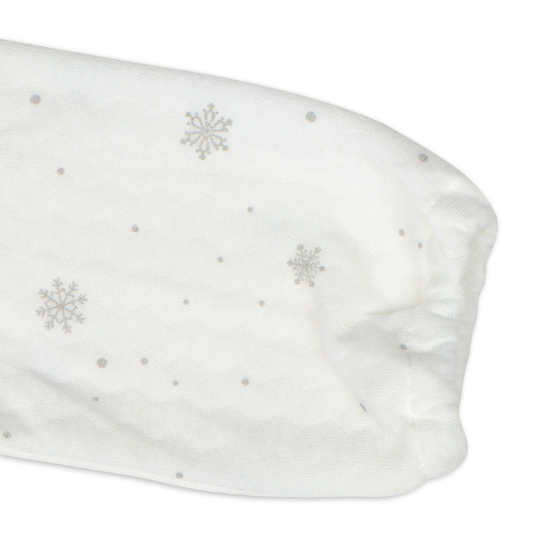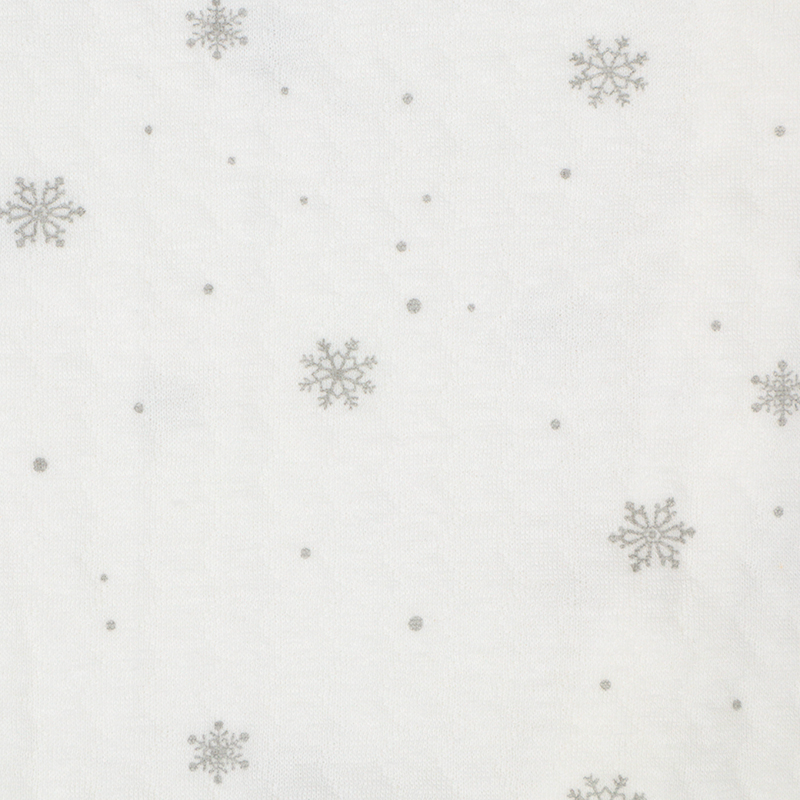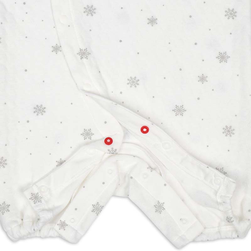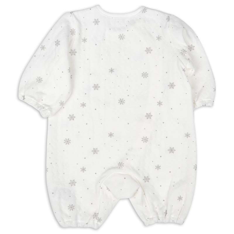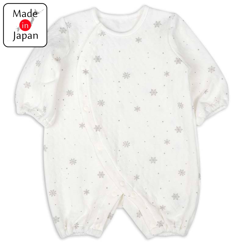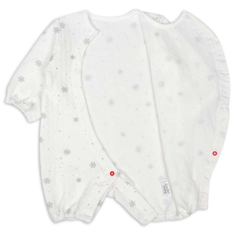 雪の結晶柄のかわいいちびオールです。 ソフトキルト素材のこの商品は、その名の通りソフトな肌ざわりが特徴。 また生地は間に薄い綿をはさんでいるので、ふっくらとした適度な厚みで暖かな着心地です。 赤ちゃんの動きを妨げないデザインは、手足をバタバタ活発に動かすように なってきた赤ちゃんにピッタリです。