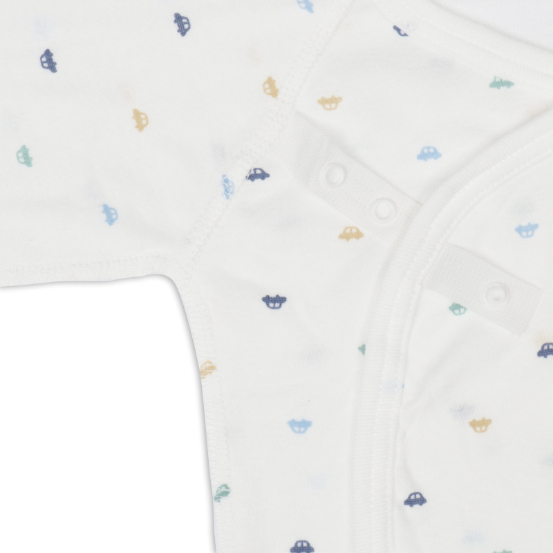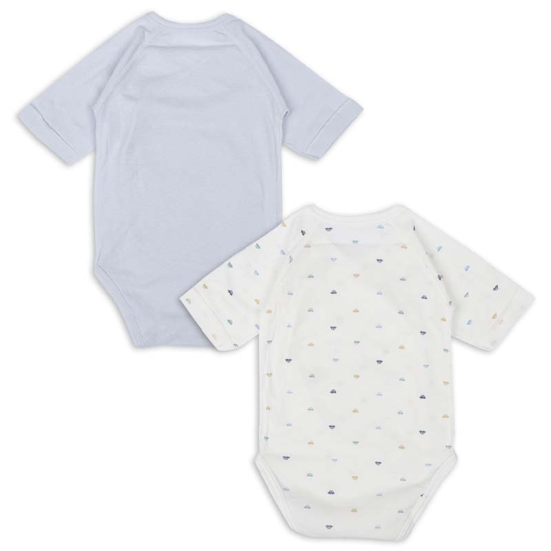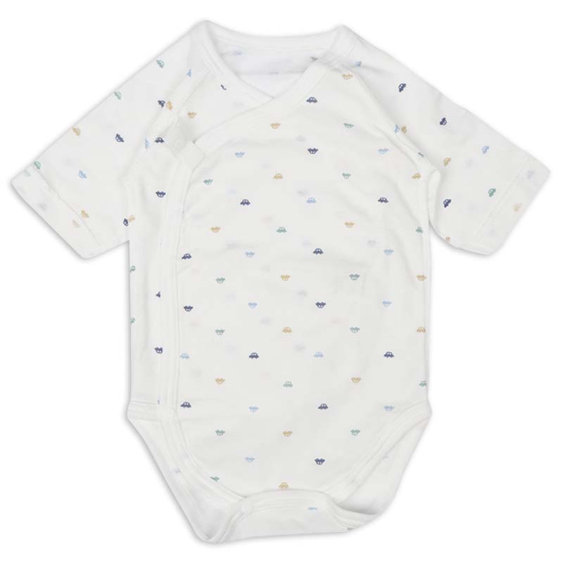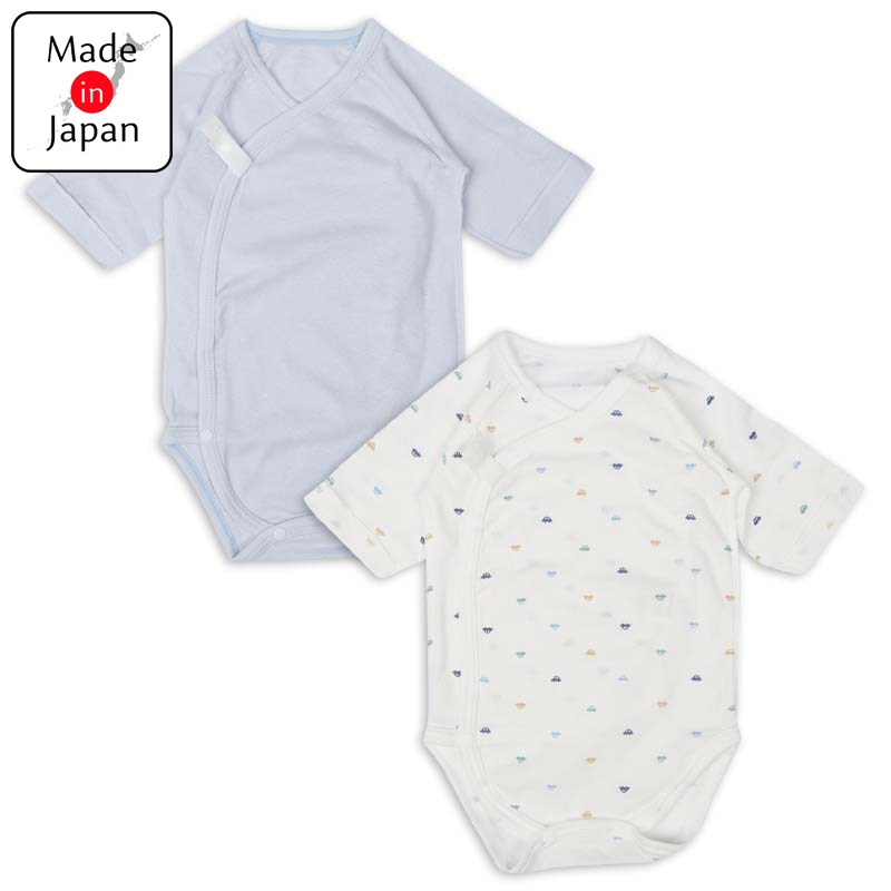 洗い替えにうれしいロンパース2枚セット 肌触りの良い綿100%のフライス生地使用。 縫いしろは赤ちゃんの肌に直接あたらないやさしい仕様。 外側はスナップタイプでお着替え簡単。 内側はひもタイプで調節可能で肌当たりもやさしい