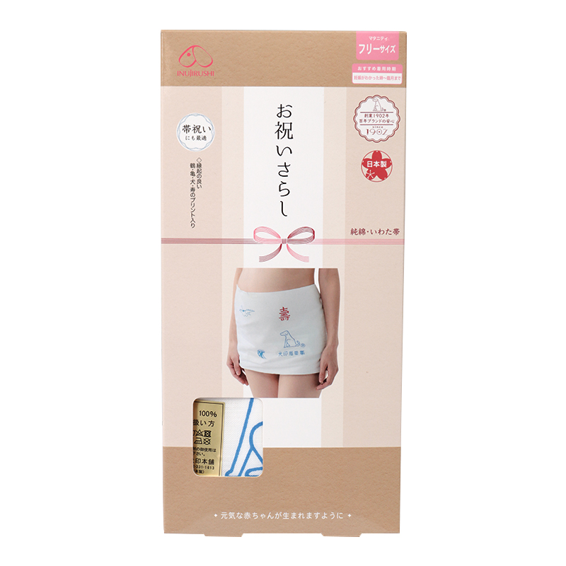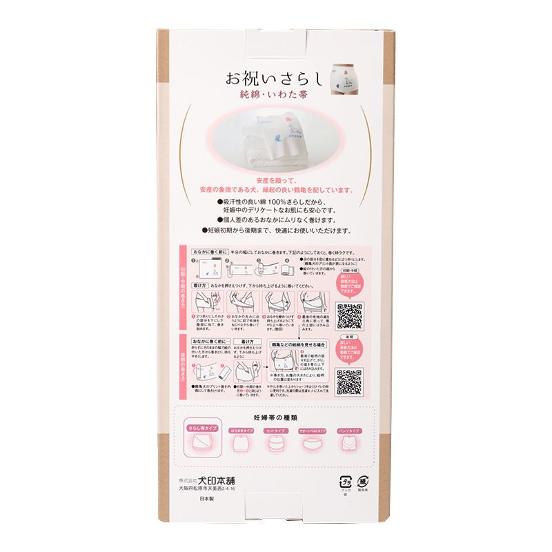 吸水性の良い無蛍光の綿100%さらしだから、妊娠中のデリケートなお肌にもオススメ。個人差のあるおなかにムリなく巻ける一枚生地で、妊娠初期から後期まで快適にお使いいただけます。 安産を願って、安産の象徴である犬、縁起の良い鶴亀を配しています。