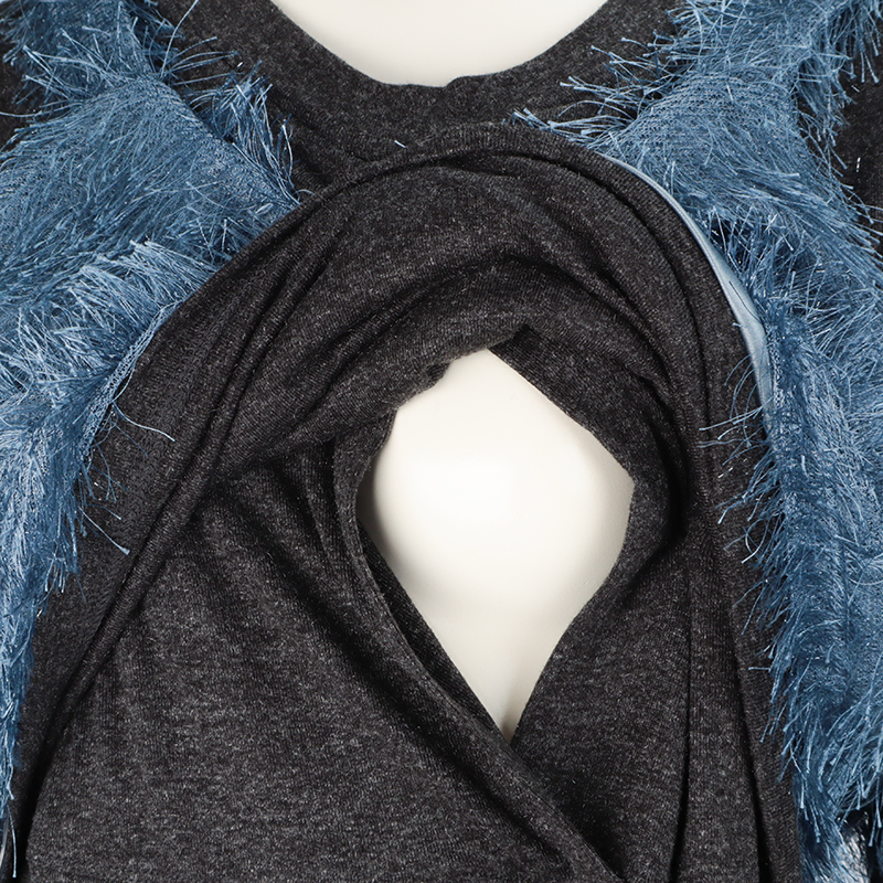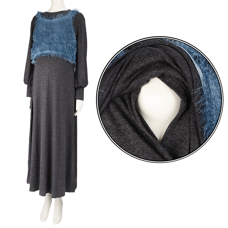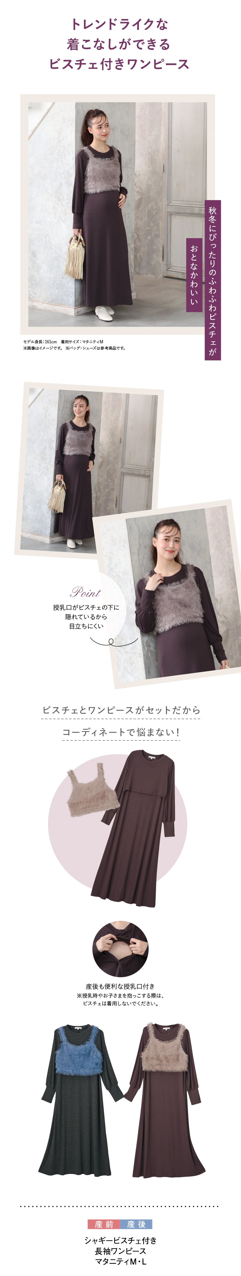 シャギービスチェ付きの長袖ワンピースとなります。 ワンピースは、起毛ニットソー素材になっております。 ワンピースは、ボリューム袖タイプになっております。 ワンピースの前身の切り替え部分をめくって、授乳するタイプです。