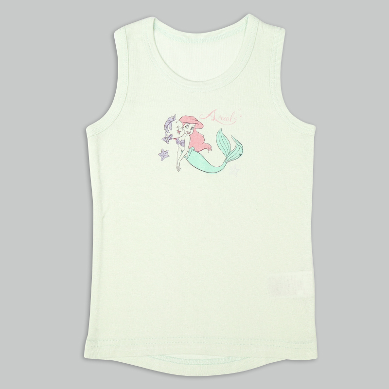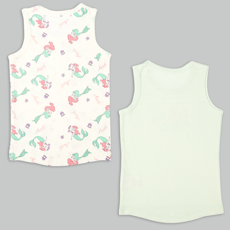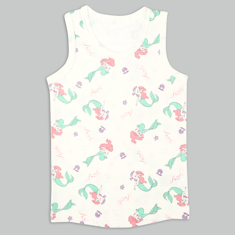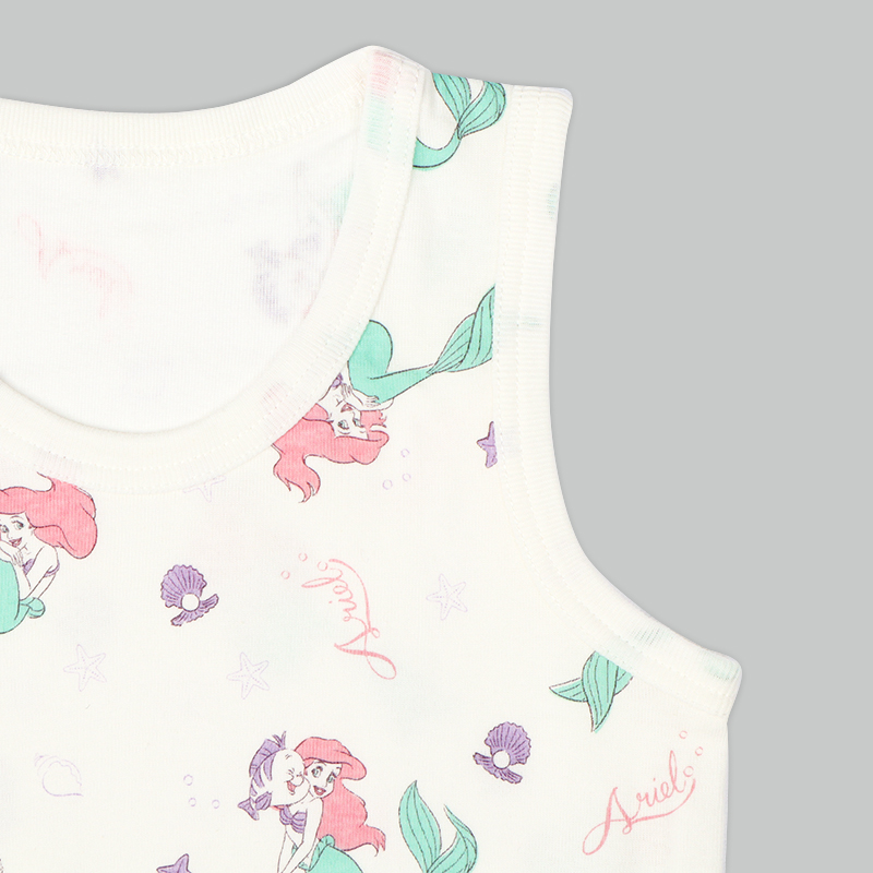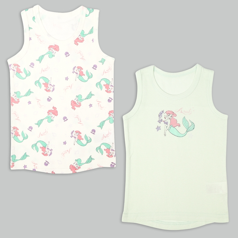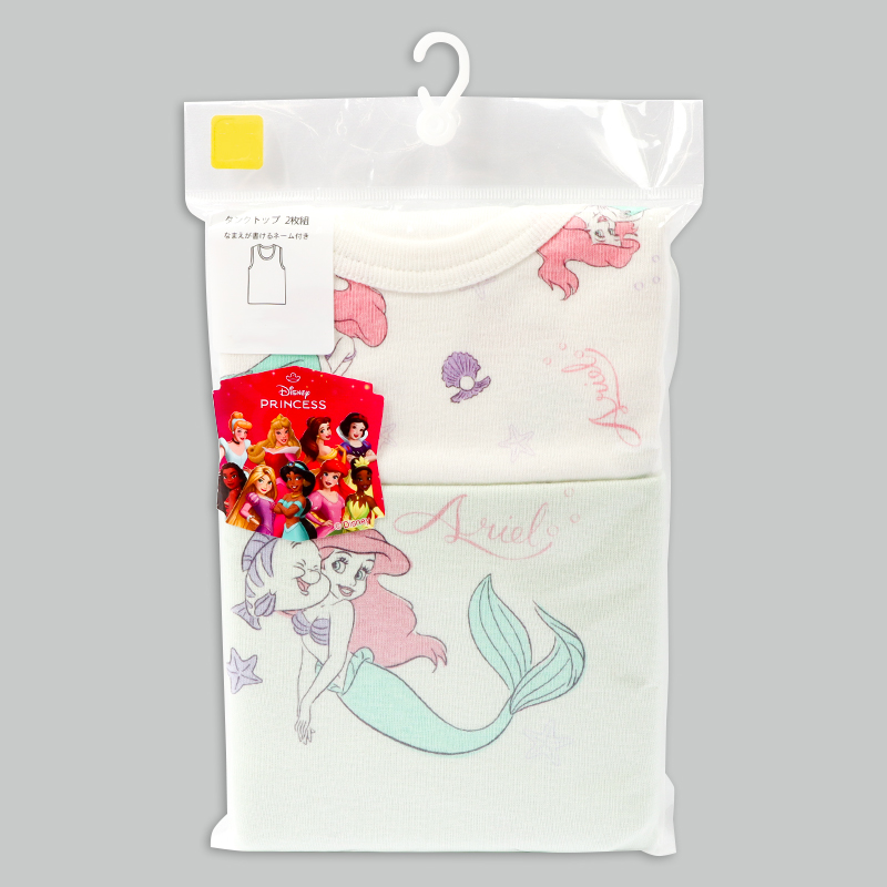 人気のアリエルがプリントされたタンクトップです。 二枚組みなので洗いかえが出来、また、ワンポイントと総柄なので気分によって着せ替えが出来ます。 伸び・肌触りの良いフライス素材は綿100%。肌着での活躍間違いなしです。