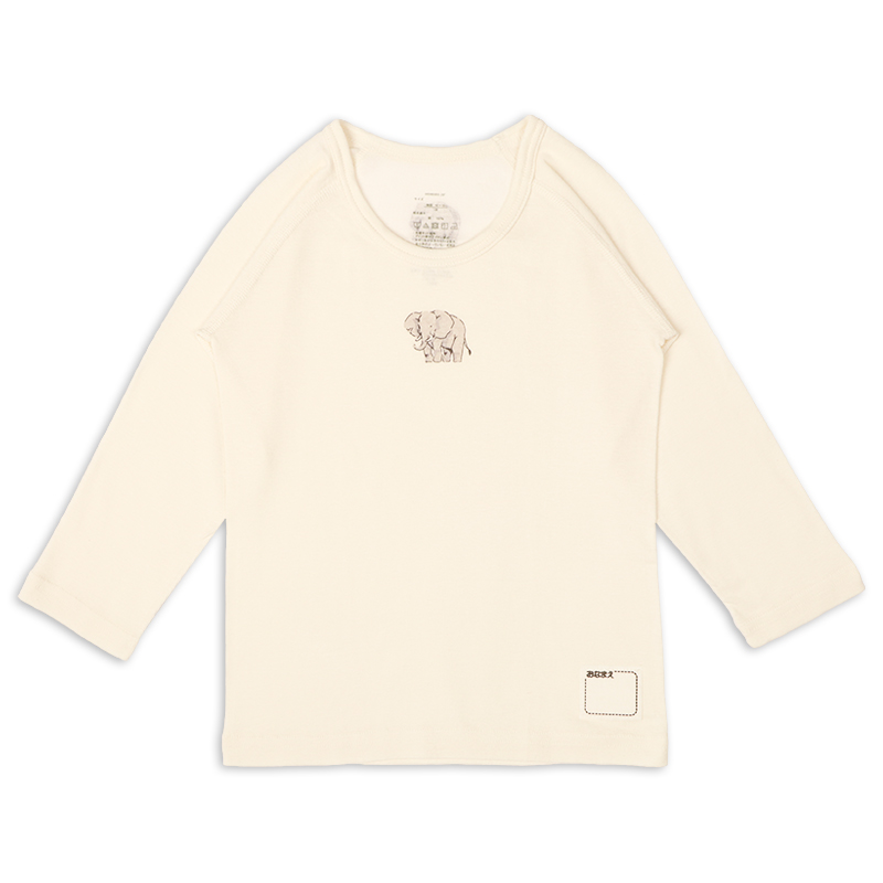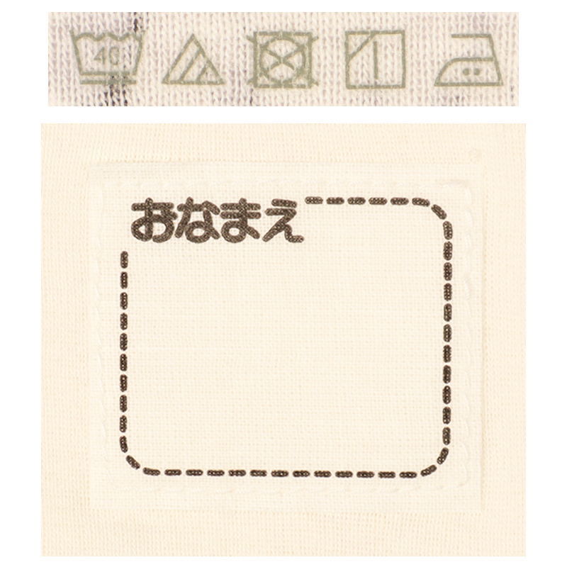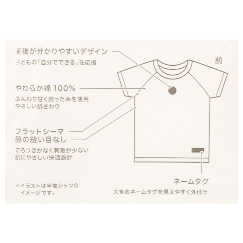 お子様の『自分でできる』を応援するために前後がわかりやすいデザインにしました。 (前と後ろのプリントを変えることで一目で前後がわかります) ふんわり甘く撚った糸を使用した生地でやさしい肌ざわり 脇の縫い目がない丸胴生地を使用、ラグラン縫い合わせ部分はごろつきが少ない縫製仕様 洗濯ネームは転写式でちくちくしません 大きめの外付けネームタグを採用