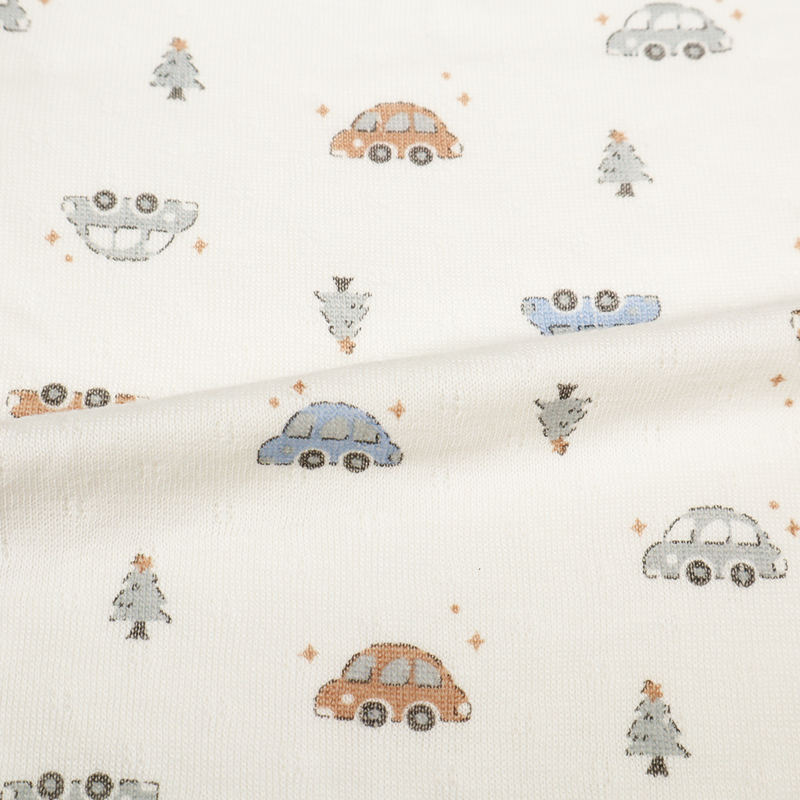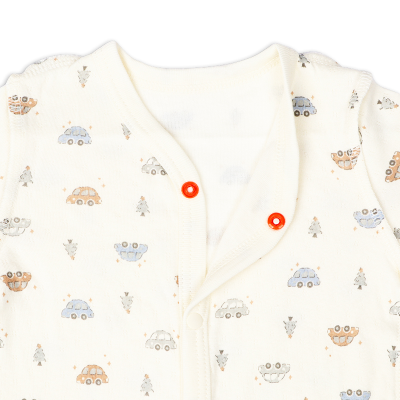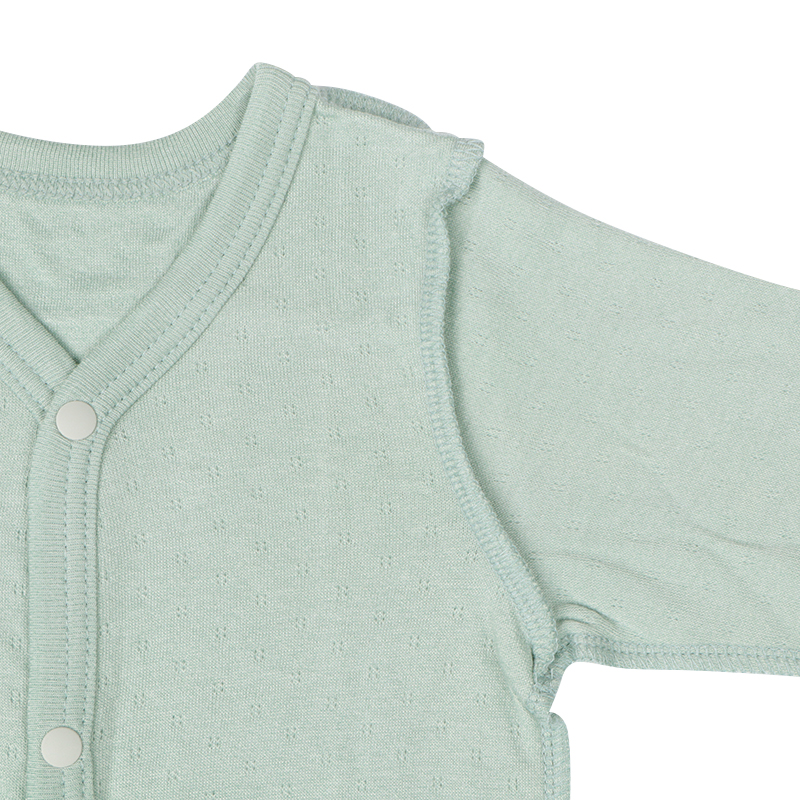 本体に使用している接結生地は、2枚の生地を重ねて部分的に接結(つなぎ合わせる)した素材で 空気を含んだ柔らかい風合いが特徴です。空気の層ができることで、暖かさを保ちやすい素材です。 前開きなので大きく開いてお着替えラクラク。 股ボタン開閉でおむつ替えもカンタンです。 洗い替えに便利な2枚組のロンパース