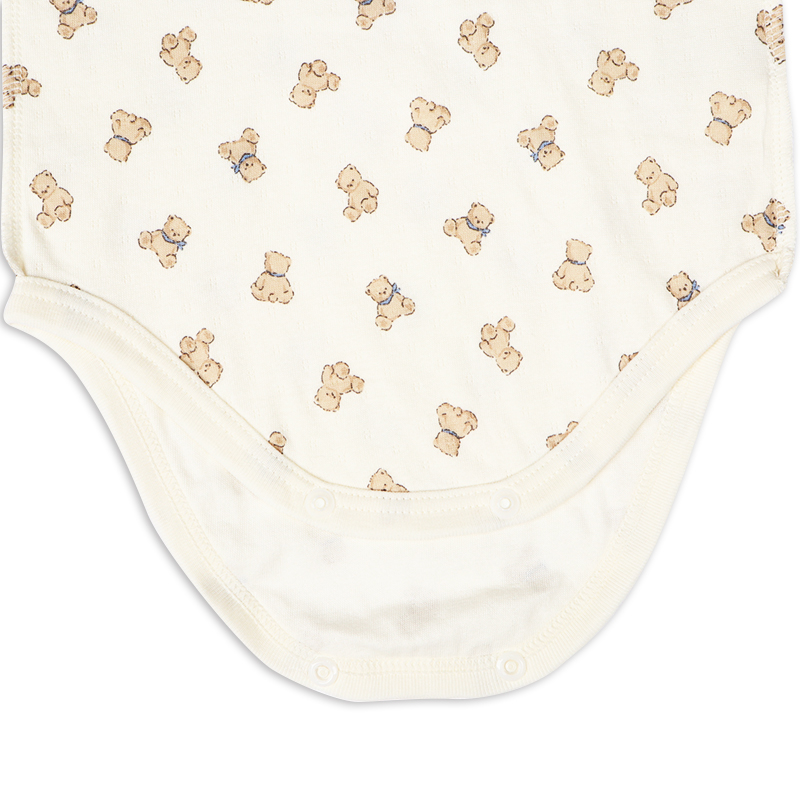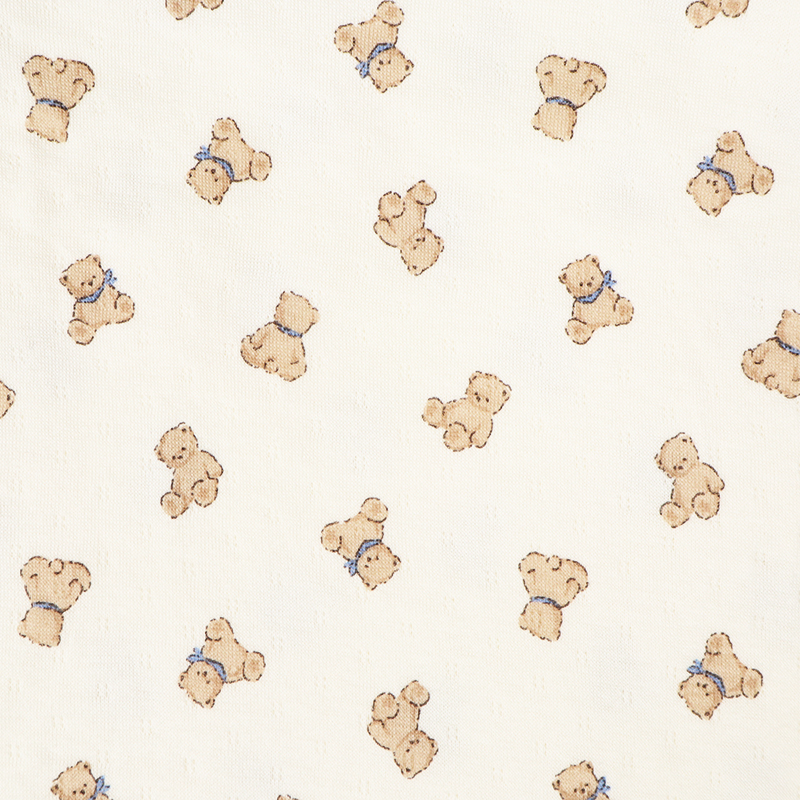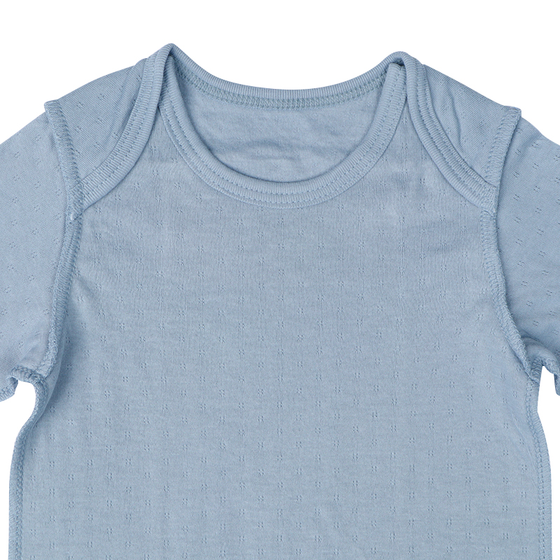 本体に使用している接結生地は、2枚の生地を重ねて部分的に接結(つなぎ合わせる)した素材で 空気を含んだ柔らかい風合いが特徴です。空気の層ができることで、暖かさを保ちやすい素材です。 ショルダータイプでお着替えラクラク。 股ボタン仕様でおむつ替えも簡単です。 洗い替えに便利な2枚組のロンパース