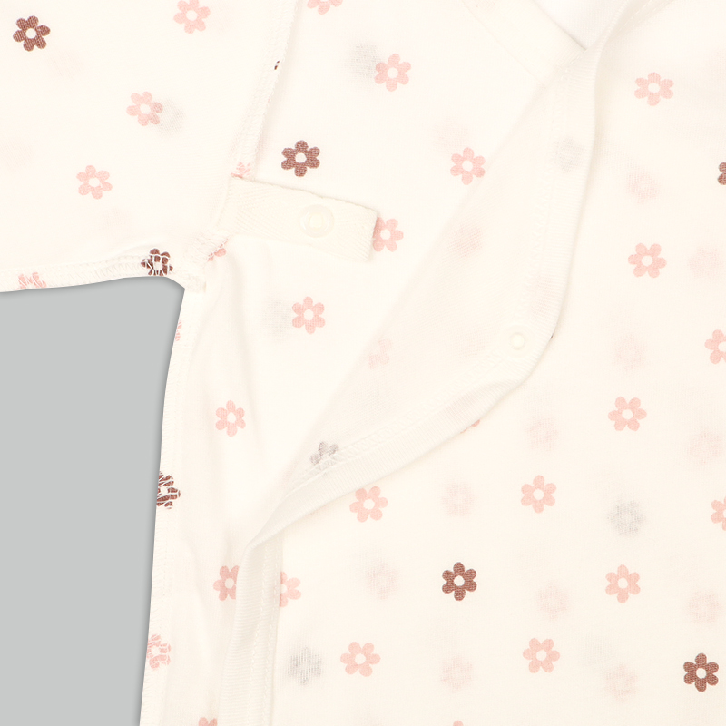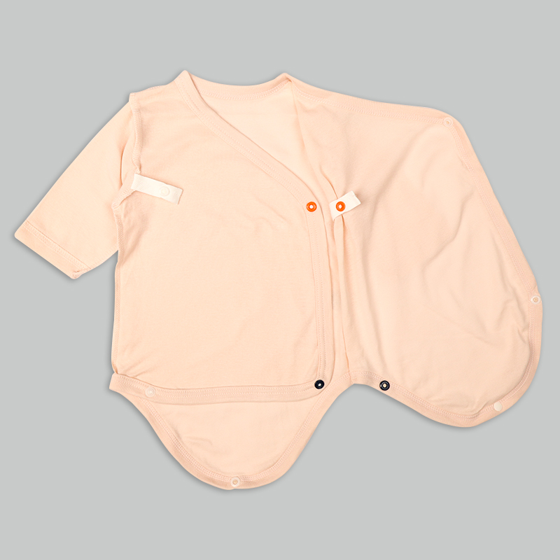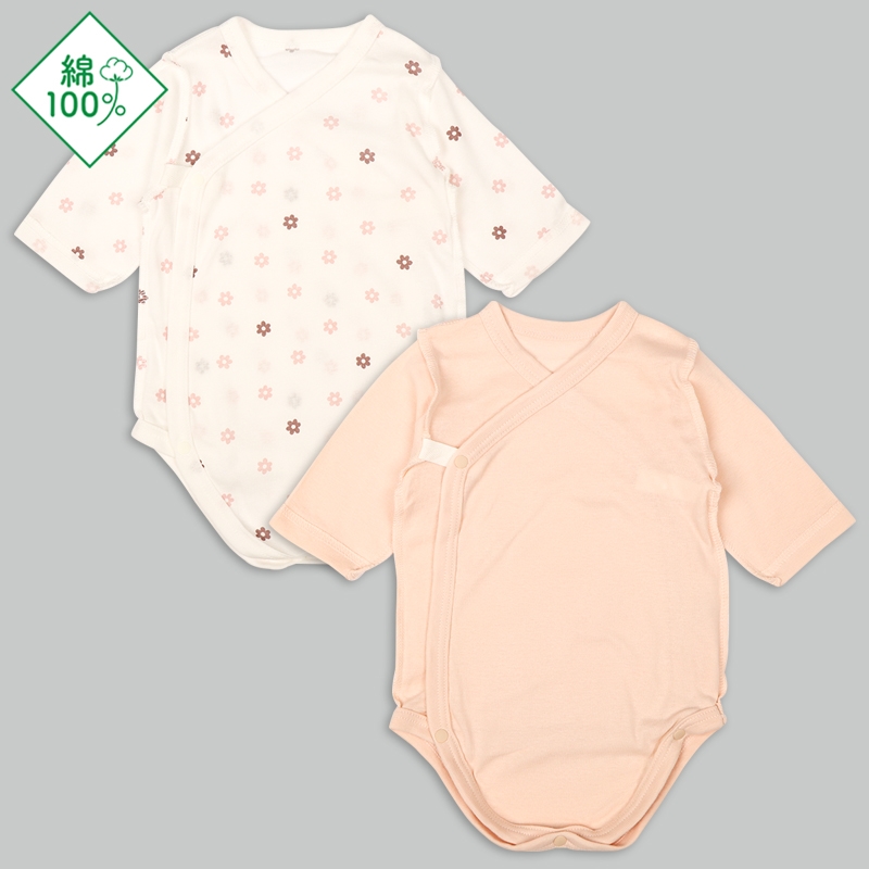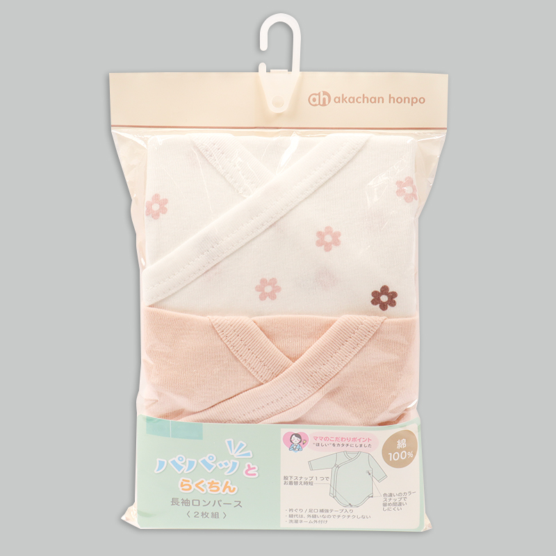 袖下から脇は外縫い仕様で、縫いしろが肌に当たらずチクチクしません。 洗濯ネームも外側に取り付け、やさしい着心地を追求しました。 スナップボタンの数は他の前開きタイプのロンパース肌着と比べて少なめで、 着替えの時間を短縮。 付け間違えやすい箇所には色違いスナップを採用し、留め間違いを防ぎます。 肌ざわりの良い綿100%生地で、デリケートな肌にも安心。 洗い替えにうれしい2枚組で、忙しい毎日にもぴったりの一着です。