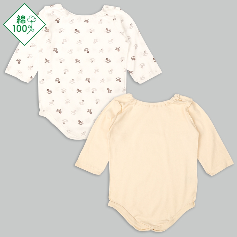 袖下から脇は外縫い仕様で、縫いしろが肌に触れずチクチクしません。 洗濯ネームも外側に配置し、やさしい着心地に。前後どちらでも着られ るデザインで、衿ぐりは大きく伸びるゴム仕様で頭からも足からもスムーズに着脱可能。 股下のスナップは1つだけで時短にも。 綿100%の柔らか素材で、洗い替えにうれしい2枚組。 毎日使いたくなる工夫がいっぱいです。