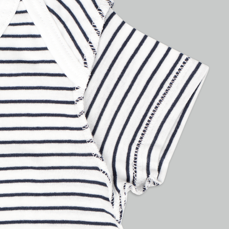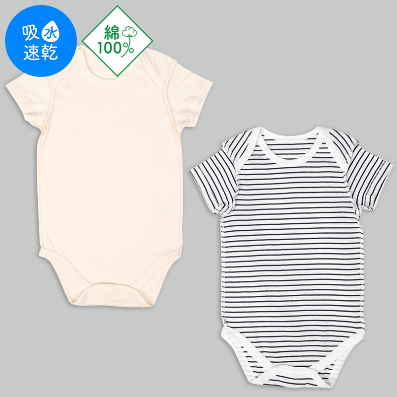 綿100%のやわらかく伸びのよいフライス編み素材に、汗をかいても乾きやすい吸水速乾機能をプラス。 衿ぐりや足口には補強テープ入り。 縫い代は外縫いで、洗濯ネームも外付けだからチクチクしません。 かぶり仕様でお着替えラクラク。 股部分はスナップボタンでおむつ替えもスムーズ。 洗い替えに便利な2枚組で、毎日の子育てをしっかりサポートします。