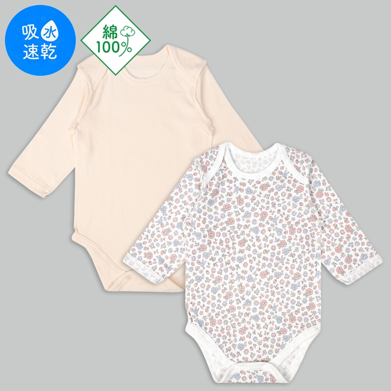 綿100%のやわらかく伸びのよいフライス編み素材に、汗をかいても乾きやすい吸水速乾機能をプラス。 衿ぐりや足口には補強テープ入り。 縫い代は外縫いで、洗濯ネームも外付けだからチクチクしません。 かぶり仕様でお着替えラクラク。 股部分はスナップボタンでおむつ替えもスムーズ。 洗い替えに便利な2枚組で、毎日の子育てをしっかりサポートします。